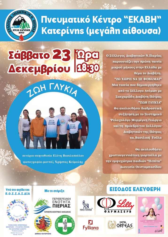«Ζω χωρίς να σε φοβάμαι» – προβολή ταινίας από τον σύλλογο Διαβητικών Ν. Πιερίας (Σάββατο 23/12 & ώρα 18:30 στο Πνευματικό Κέντρο με την υποστήριξη του Δήμου Κατερίνης)