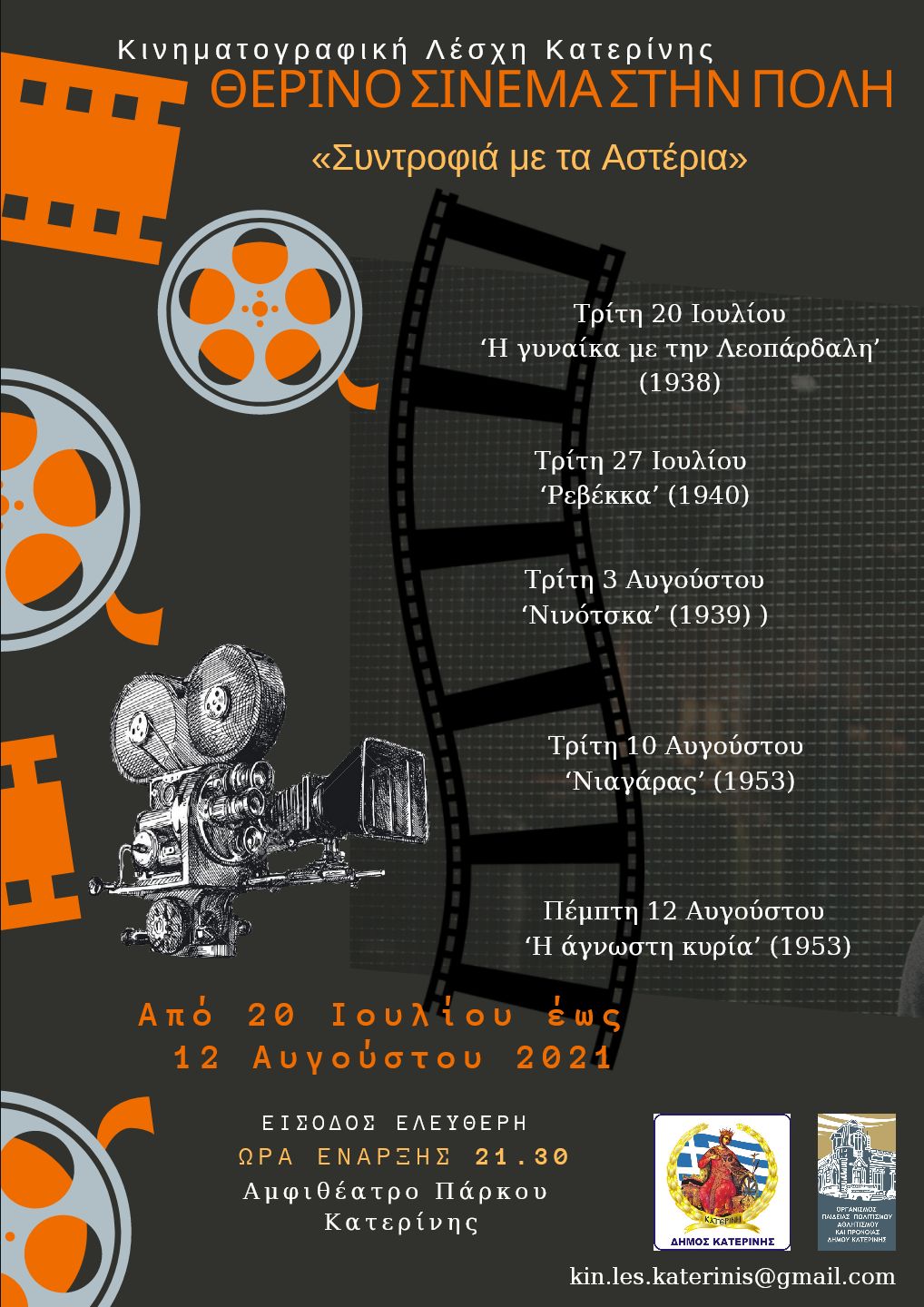 «Η γυναίκα με τη λεοπάρδαλη», μια ταινία γεμάτη από φάρσες και σάτιρα, σε σκηνοθεσία Χάουαρντ Χοκς και με πρωταγωνιστές τους: Κάθριν Χέπμπορν, Κάρι Γκραν και Τσαρλς Ραγκλς, είναι η πρώτη ταινία που θα προβληθεί αυτό το καλοκαίρι στο κοινό της Κατερίνης, με δωρεάν είσοδο και κατάλληλη για κάθε ηλικία.