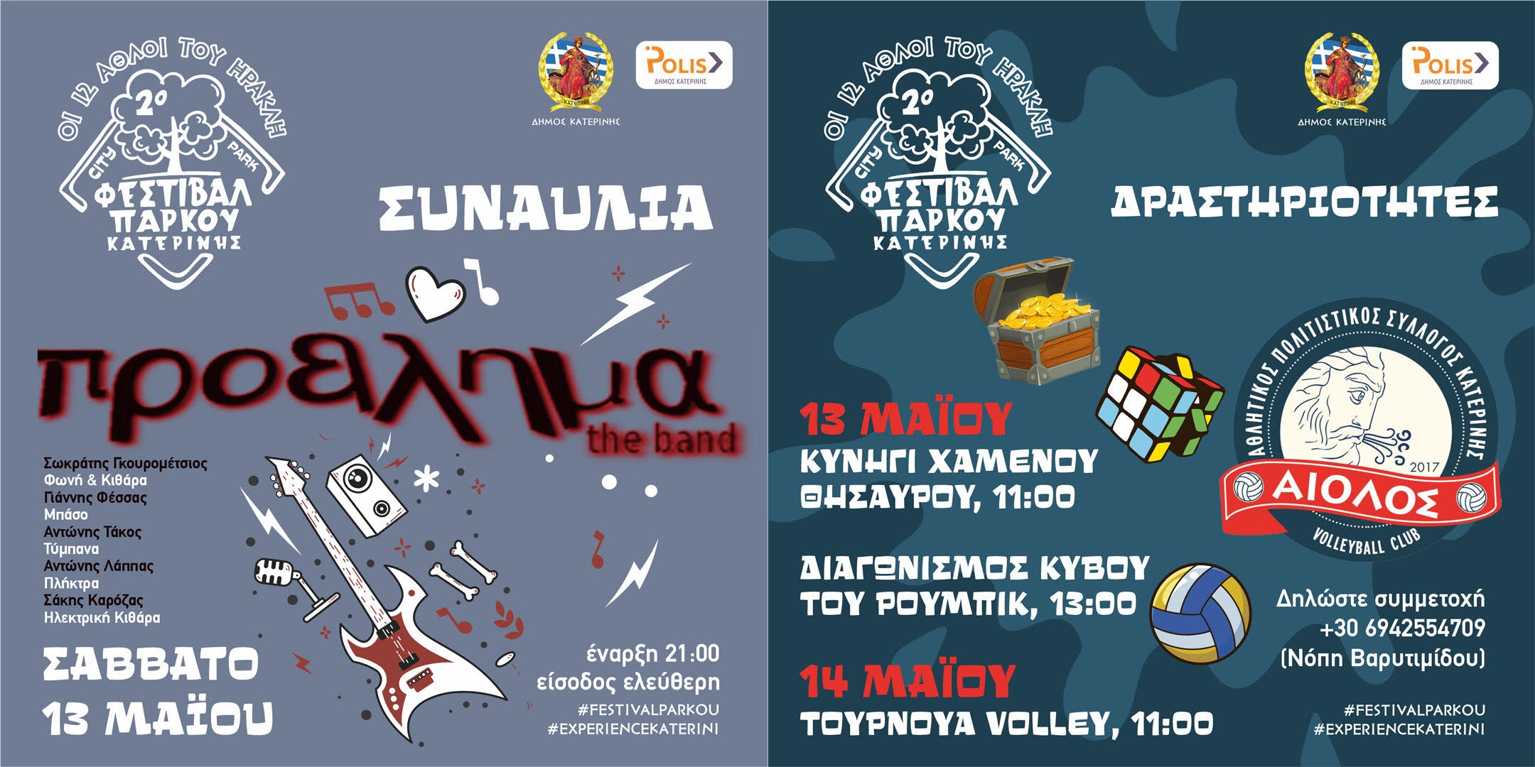 Περισσότερες πληροφορίες για το πρόγραμμα του Φεστιβάλ Πάρκου εδώ: https://katerini.gr/2023/05/03/2%ce%bf-%cf%86%ce%b5%cf%83%cf%84%ce%b9%ce%b2%ce%b1%ce%bb-%cf%80%ce%b1%cf%81%ce%ba%ce%bf%cf%85-%ce%ba%ce%b1%cf%84%ce%b5%cf%81%ce%b9%ce%bd%ce%b7%cf%83-%cf%80%cf%81%cf%8c%ce%b3%cf%81%ce%b1/