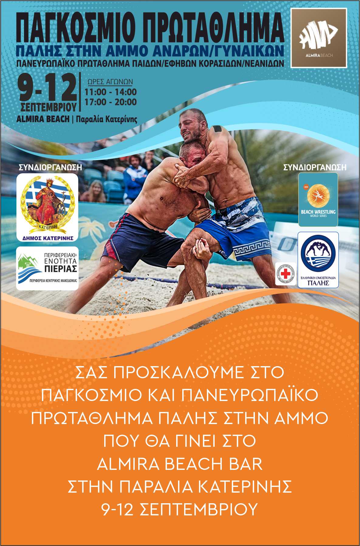 Σας προσκαλούμε στην επίσημη τελετή έναρξης του Παγκόσμιου & Πανευρωπαϊκού πρωταθλήματος Πάλης στην Άμμο, αύριο Παρασκευή 10 Σεπτεμβρίου 2021 στις 18:30 στην πλατεία Ελευθερίας.