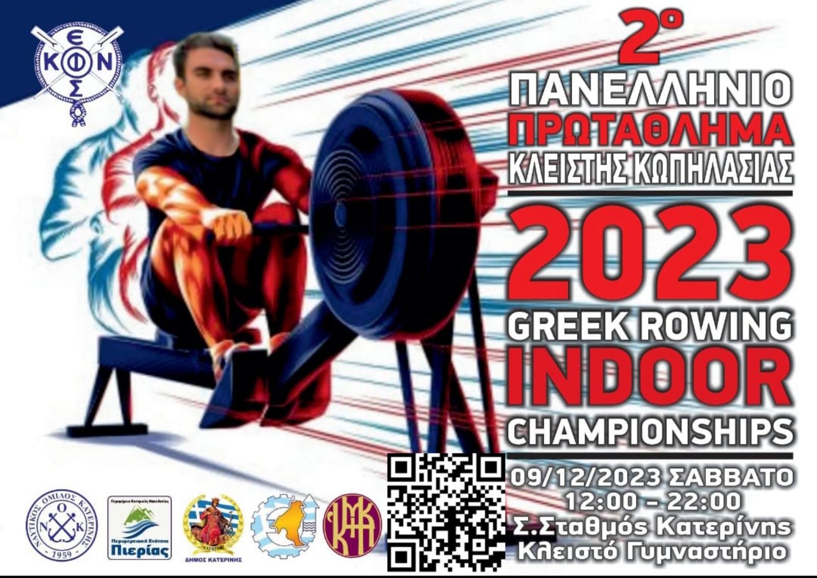 Η Ελληνική Κωπηλατική Ομοσπονδία Φιλάθλων Ναυτικών Σωματείων, ο Δήμος Κατερίνης και ο Ναυτικός Όμιλος Κατερίνης, σας προσκαλούν στο 2ο Πανελλήνιο Πρωτάθλημα Κλειστής Κωπηλασίας, που θα διεξαχθεί το Σάββατο 09 Δεκεμβρίου 2023, στο Γυμναστήριο Τ9 του Σιδηροδρομικού Σταθμού Κατερίνης, στις 12.30 μ.μ.
