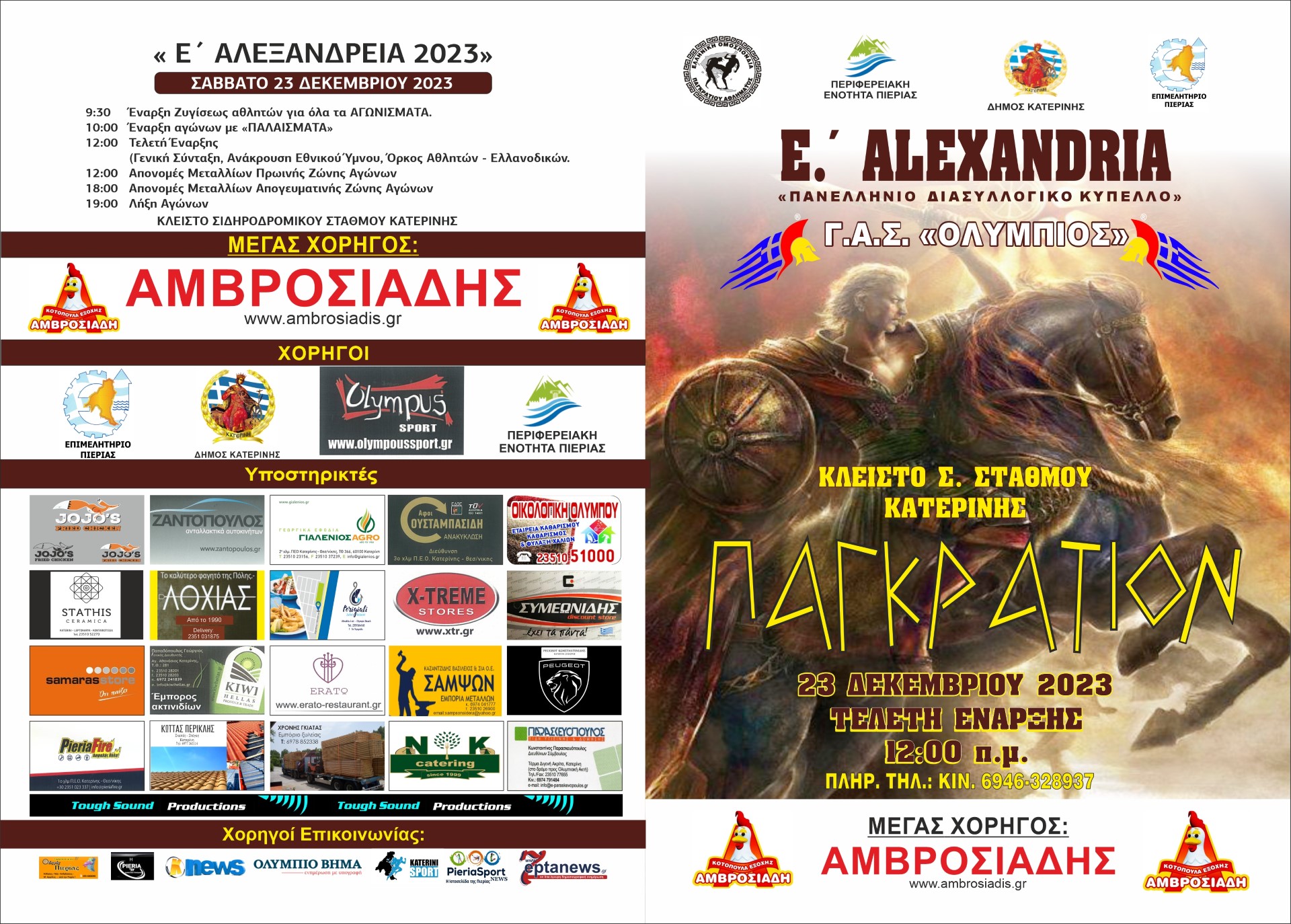 Η Κατερίνη φιλοξενεί τα Ε’ ΑΛΕΞΑΝΔΡΕΙΑ (Πανελλήνιο Διασυλλογικό Κύπελλο Παγκρατίου Αθλήματος) – Το Σάββατο 23/12 στο κλειστό γυμναστήριο του Σ. Σταθμού