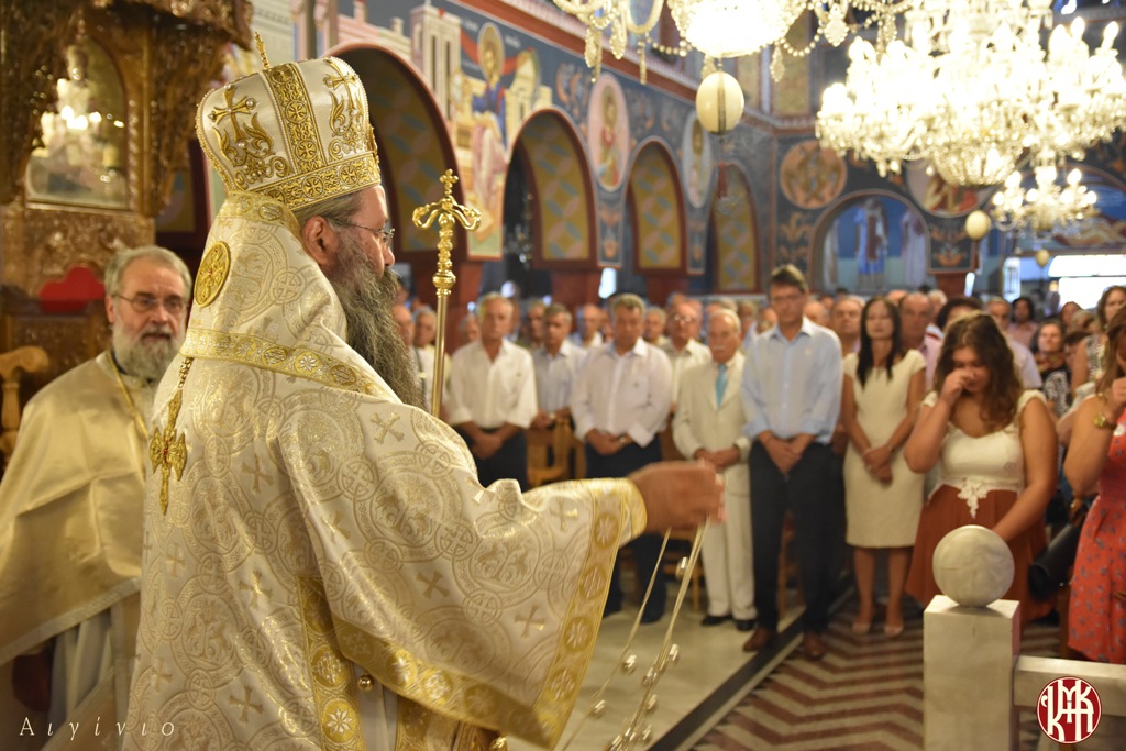 · Το πρωί της κυριώνυμης ημέρας, μετά τη Θ. Λειτουργία, τέλεσε την Ακολουθία των Εγκωμίων της Παναγίας στον πανηγυρίζοντα Ιερό Ναό Κοιμήσεως Θεοτόκου Αιγινίου.