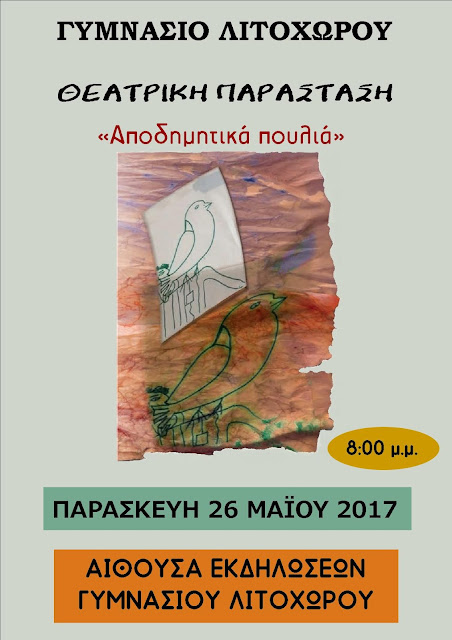 Το Γυμνάσιο Λιτοχώρου και η θεατρική ομάδων των μαθητών της Γ’ τάξης σας προσκαλούν στη θεατρική παράσταση «Αποδημητικά πουλιά» που θα πραγματοποιηθεί την Παρασκευή, 26 Μαΐου 2017, και ώρα 20:00 στην αίθουσα εκδηλώσεων του Γυμνασίου.
