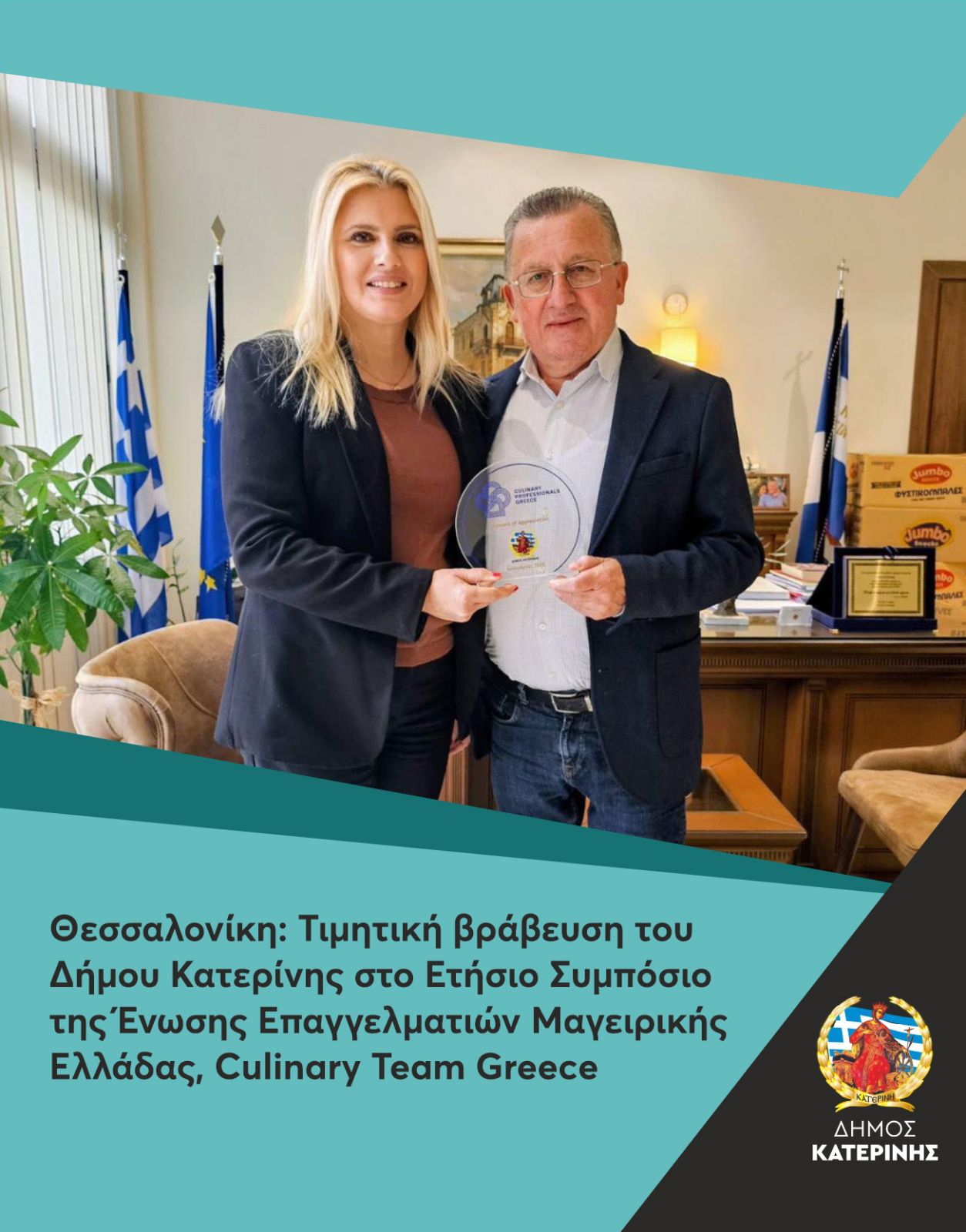 Τιμητική βράβευση στον Δήμο Κατερίνης, στη διάρκεια του Ετήσιου Συμποσίου της Ένωσης Επαγγελματιών Μαγειρικής Ελλάδας, που πραγματοποιήθηκε το βράδυ της περασμένης Τρίτης στη Θεσσαλονίκη. Συγκεκριμένα, η βράβευση είναι απόρροια της εξαιρετικής συνεργασίας του Δήμου με την επίσημη ομάδα της Ένωσης Επαγγελματιών Μαγειρικής Ελλάδας, Culinary Team Greece, στο πλαίσιο του Γαστρονομικού Φεστιβάλ του Βουνού & του Δάσους, που διοργάνωσε η Αντιδημαρχία Πολιτισμού – Τουρισμού.