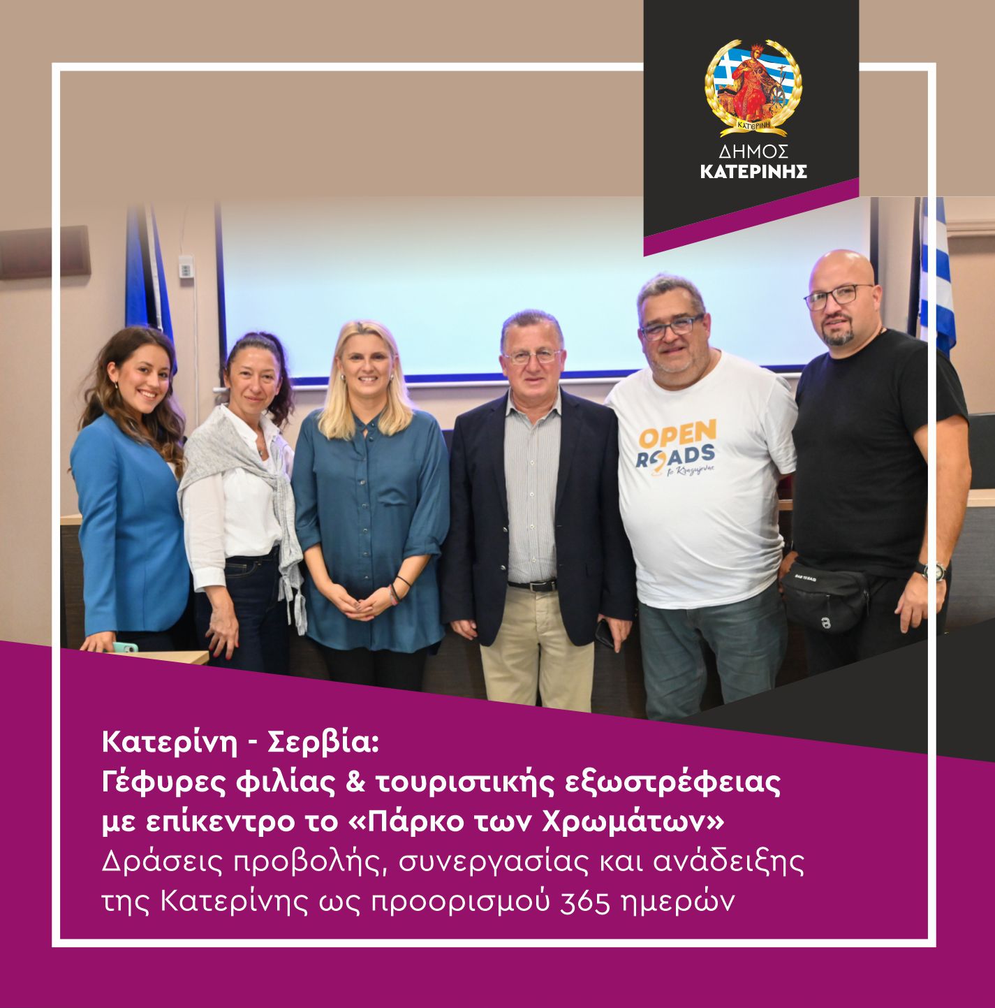 Με στόχο την ενίσχυση της τουριστικής εξωστρέφειας της Κατερίνης προς τη Σερβία, ο Δήμος Κατερίνης προχώρησε σε μια σειρά δράσεων προβολής και συνεργασίας, με στόχο την ανάδειξη της περιοχής ως ελκυστικού προορισμού καθ’ όλη τη διάρκεια του έτους. Ο λόγος για την παρουσίαση του «Πάρκου των Χρωμάτων» στο εθνικό τηλεοπτικό δίκτυο της Σερβίας (TV PRVA), για τη ρετρό εκδρομή «The Happy Eighties» από το Κραγκούγιεβατς στην Παραλία, με αφορμή την 70η επέτειο από την παραγωγή του πρώτου αυτοκινήτου ZASTAVA, καθώς και για τη συνέντευξη του Δημάρχου Κατερίνης στην TV PRVA, με θέμα την εφαρμογή του νέου Συστήματος Εισόδου/Εξόδου (EES) της Ευρωπαϊκής Ένωσης.