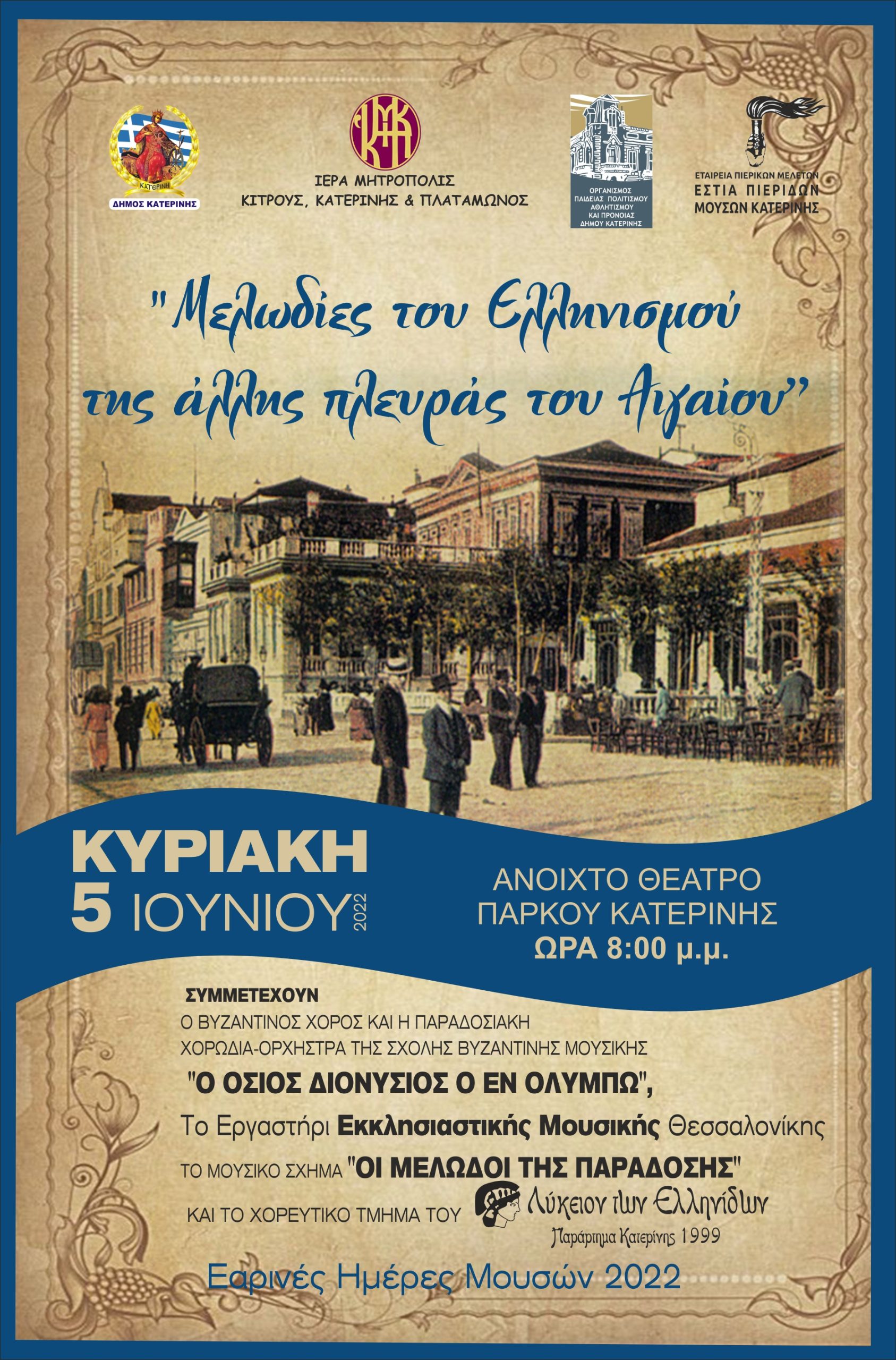 Η εκδήλωση με τίτλο: «Μελωδίες του Ελληνισμού της άλλης πλευράς του Αιγαίου», εντάσσεται στο πλαίσιο των Εαρινών Ημερών Μουσών 2022 και κατόπιν της χθεσινοβραδινής αναβολής λόγω καιρού, θα πραγματοποιηθεί τελικά την Κυριακή 05 Ιουνίου & ώρα 20:00, στο ανοικτό θέατρο του δημοτικού πάρκου Κατερίνης.