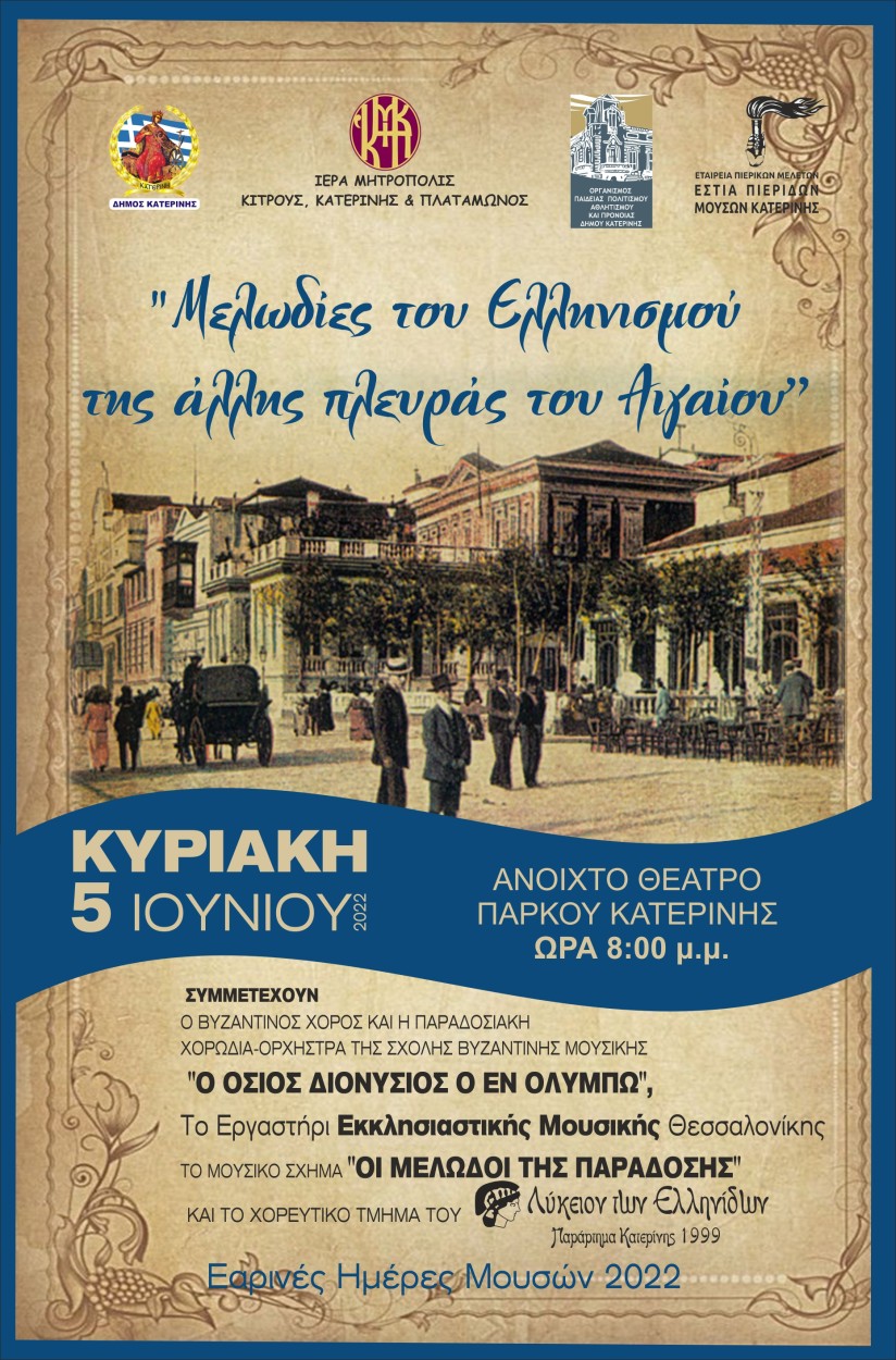 Η εκδήλωση με τίτλο: «Μελωδίες του Ελληνισμού της άλλης πλευράς του Αιγαίου», εντάσσεται στο πλαίσιο των Εαρινών Ημερών Μουσών 2022 και κατόπιν της πρόσφατης αναβολής λόγω καιρού, θα πραγματοποιηθεί τελικά την Κυριακή 05 Ιουνίου & ώρα 20:00, στο ανοικτό θέατρο του δημοτικού πάρκου Κατερίνης.