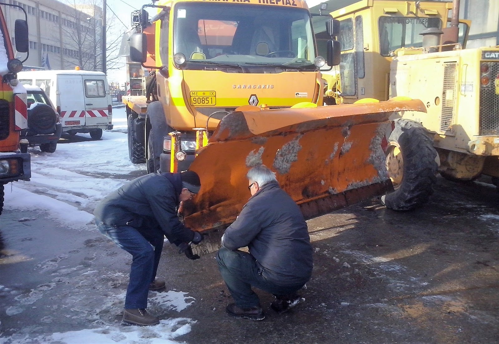 Έτσι σήμερα, από νωρίς το πρωί, το αμαξοστάσιο της Διεύθυνσης Τεχνικών Έργων της Π.Ε. Πιερίας μετατράπηκε σε μηχανουργείο ώστε οι έμπειροι χειριστές των μηχανημάτων αποχιονισμού να μπορέσουν να προβούν στις απαραίτητες εργασίες συντήρησης τους.