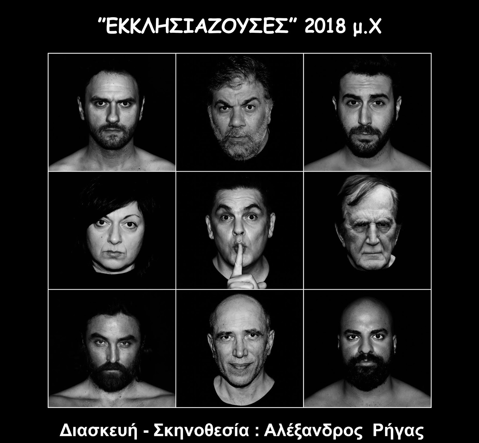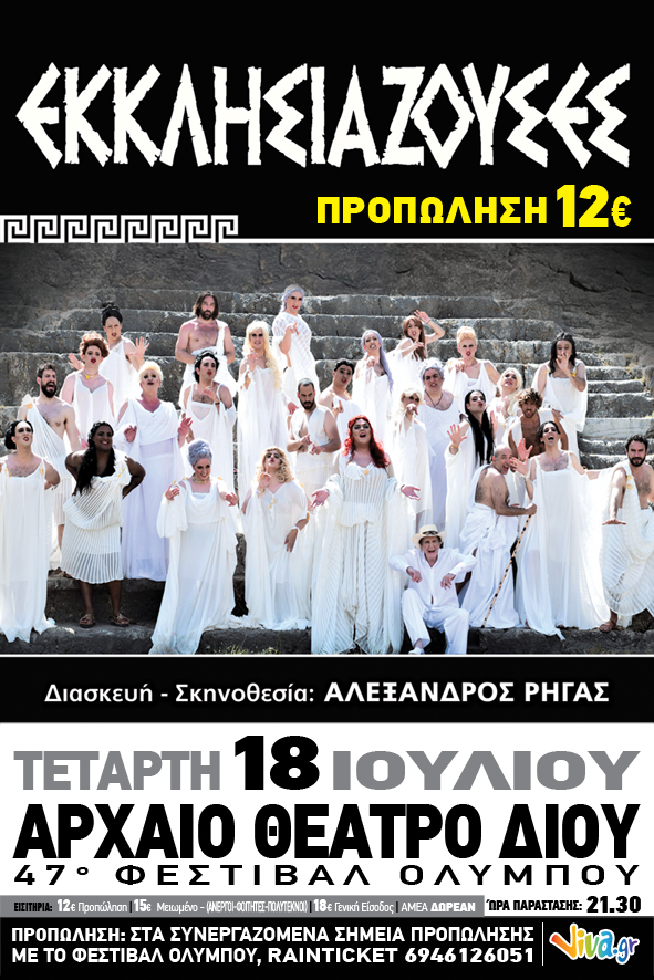 Την κωμωδία «Εκκλησιάζουσες» παρουσιάζει το 47ο Φεστιβάλ Ολύμπου στις 18 Ιουλίου στο Αρχαίο Θέατρο Δίου. Τις «Εκκλησιάζουσες» που το ΔΗ.ΠΕ.ΘΕ. Σερρών εμπιστεύτηκε στον Αλέξανδρο Ρήγα να σκηνοθετήσει. Ήταν η πρώτη φορά που ο σκηνοθέτης- ηθοποιός επεξεργάστηκε Αριστοφάνη, τον είδε με τον δικό του δημιουργικό τρόπο αλλά και με απόλυτο σεβασμό στο κείμενο. Ο Αλέξανδρος Ρήγας κράτησε δραματουργικά το περιβάλλον της αρχαίας Αθήνας και πειραματίστηκε με τους όρους της Αριστοφανικής εποχής. Επέλεξε να συνεργαστεί με έναν ανδροκρατούμενο θίασο, 28 άτομα, μέσα στους οποίους υπάρχει η Σοφία Μουτίδου. Όλοι τους προσεγγίζουν με σεβασμό και χωρίς υπερβολές και χυδαιότητα το κείμενο αλλά και τους γυναικείους ρόλους τους. Οι Αντώνης Λουδάρος, Δημήτρης Σταρόβας, Μελέτης Ηλίας, Ησαΐας Ματιάμπα, Ιβάν Σβιτάιλο, Γιάννης Κρητικός, Γιώργος Κωνσταντίνου στήνουν ένα χορό γεμάτο κέφι και όρεξη και δίνουν στη ζωή τον χώρο και το χρώμα που της ανήκει. Η ζωή, η πολιτική, η ισότητα, το γέλιο, η χαρά, η δημοκρατία και το θέατρο… ανήκουν σε όλους. Και οι Εκκλησιάζουσες του Αλέξανδρου Ρήγα έρχονται αυτό το καλοκαίρι να μας θυμίσουν ποιες είναι και ποιοι είμαστε.