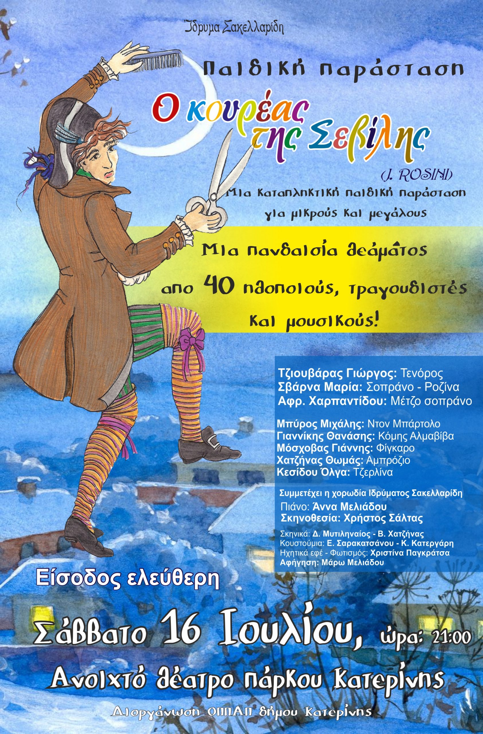 Με τον «κουρέα της Σεβίλλης» το κλασικό έργο (κωμική όπερα) του Τζοακίνο Ροσσίνι, σε μετάφραση Τζωρτζίνας Μακρή και διασκευή Χρήστου Σάλτα, μία παιδική παράσταση για μικρούς και….. μεγάλους, συνεχίζεται το καλοκαίρι στην Κατερίνη της Τέχνης & του Πολιτισμού, οι εκδηλώσεις που με ιδιαίτερη επιτυχία και μεγάλη προσέλευση διοργανώνει ο Οργανισμός Πολιτισμού (ΟΠΠΑΠ) του Δήμου.