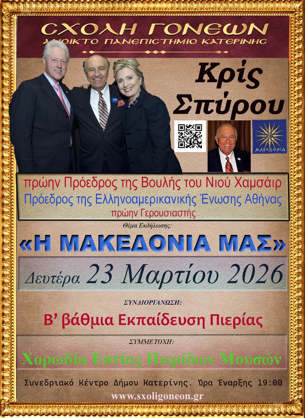 Δέχτηκα την πρόσκληση να μιλήσω στην Σχολή Γονέων – Ανοικτό Πανεπιστήμιο Κατερίνης γιατί ακούω δεξιά και αριστερά να με ρωτούν γιατί εμείς οι Ελληνοαμερικανοί αφήσαμε τον Πρόεδρο Τζορτζ Μπους να αναγνωρίσει τα Σκόπια ως “Μακεδονία”.