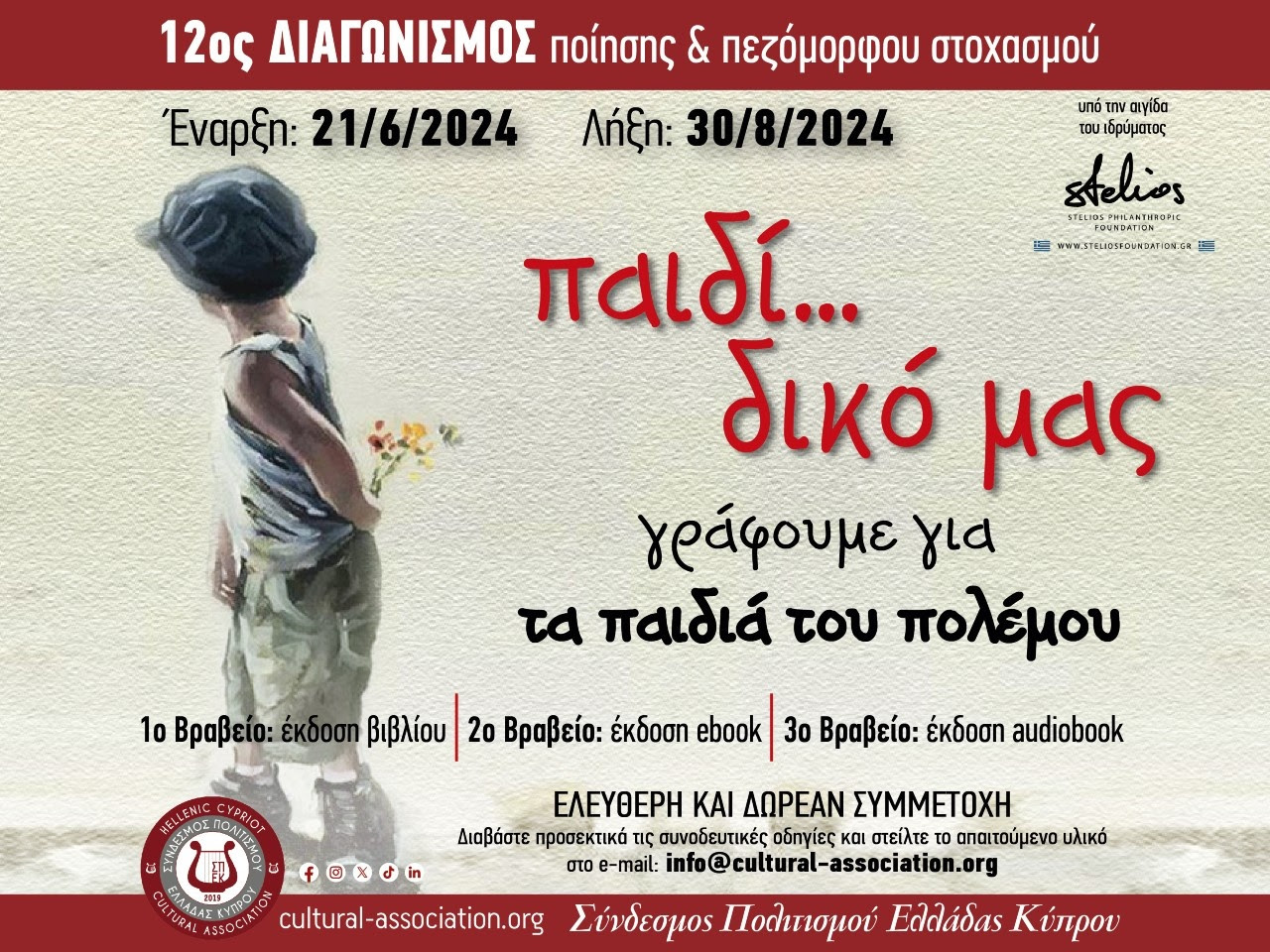 Ο Σύνδεσμος Πολιτισμού Ελλάδας Κύπρου | Σ.Π.Ε.Κ. υπό την αιγίδα του Stelios Philanthropic Foundation προκηρύσσει τον 12ο ΔΙΑΓΩΝΙΣΜΟ Ποίησης και Πεζόμορφου Στοχασμού με θέμα “Παιδί… δικό μας… γράφουμε για τα παιδιά του πολέμου“. Έναρξη Διαγωνισμού 21/6/2024. Λήξη Διαγωνισμού 30/8/2024. Ελεύθερη και Δωρεάν Συμμετοχή. Πρώτο Βραβείο: έκδοση βιβλίου. Δεύτερο Βραβείο: έκδοση eBook. Τρίτο Βραβείο: έκδοση audiobook. Διαβάστε προσεχτικά τις συνοδευτικές οδηγίες και στείλτε το απαιτούμενο υλικό στο email: [email protected]