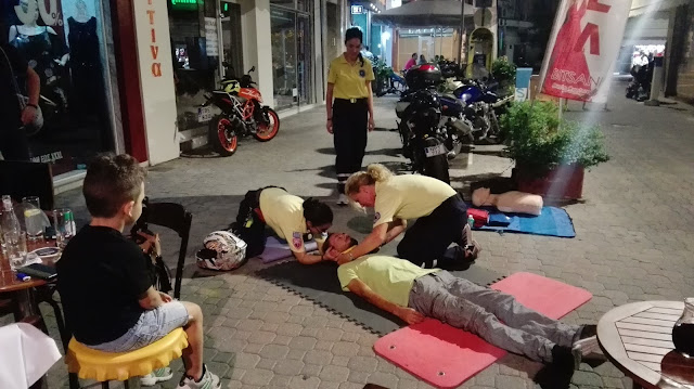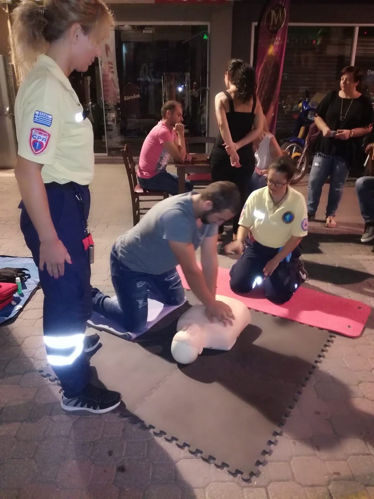 Έπειτα, ακολούθησε η εξάσκηση πάνω σε βασικές πρακτικές υποστήριξης της ζωής. Πιο συγκεκριμένα, εξασκήθηκαν στον τρόπο προσέγγισης ενός ατόμου που έχει καταρρεύσει και δεν έχει αναπνοή, στην εφαρμογή Θωρακικών Συμπιέσεων και Εμφυσήσεων Διάσωσης (Καρδιοπνευμονική Αναζωογόνηση), στην Πλάγια θέση Ασφαλείας, αλλά και στον τρόπο της άμεσης Αφαίρεσης του Κράνους σε μοτοσυκλετιστές στον τόπο του ατυχήματος.