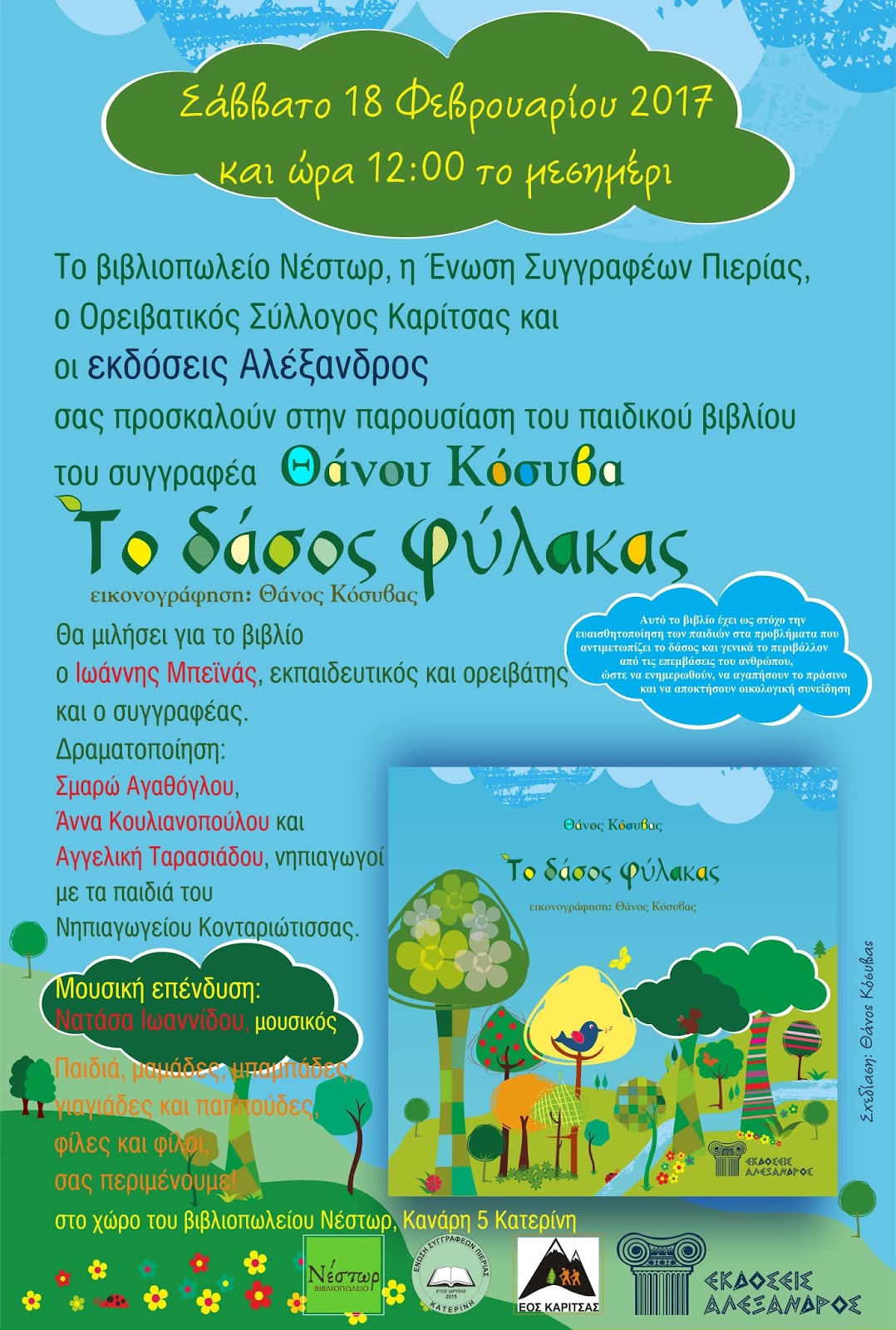 Το βιβλιοπωλείο Νέστωρ, η Ένωση Συγγραφέων Πιερίας, ο Ορειβατικός Σύλλογος Καρίτσας και οι εκδόσεις Αλέξανδρος σας προσκαλούν στην παρουσίαση του νέου παιδικού βιβλίου του συγγραφέα Θάνου Κόσυβα