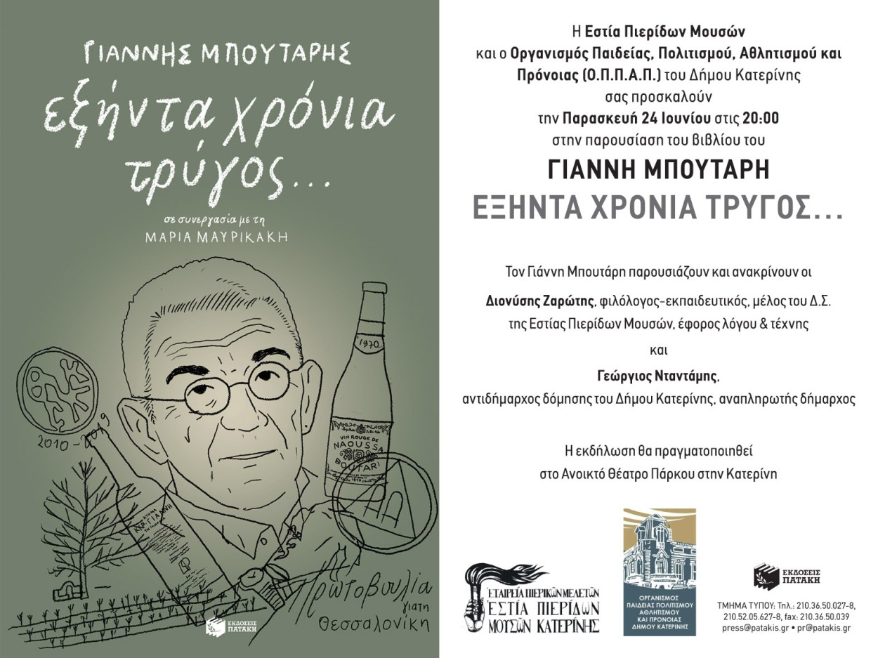 Πολιτιστικό Καλοκαίρι Δήμου Κατερίνης – Παρουσίαση του βιβλίου του Γιάννη Μπουτάρη: «60 χρόνια τρύγος…»