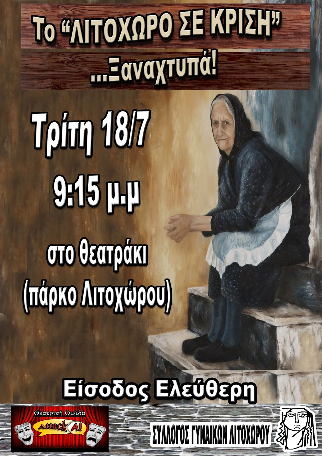 Ο Σύλλογος Γυναικών Λιτοχώρου σας καλεί στη θεατρική παράσταση "ΛΙΤΟΧΩΡΟ ΣΕ ΚΡΙΣΗ" της θεατρικής ομάδας "ΑΤΑΚΑ" που θα παρουσιαστεί την Τρίτη 18 του Ιούλη στις 9:15 μ.μ. στο Θεατράκι Λιτοχώρου.