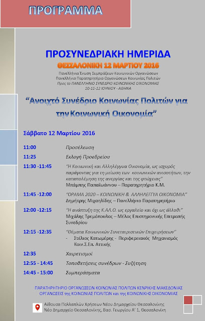 Στην Προσυνεδριακή Ημερίδα του Σαββάτου, 12 Μαρ 2016, στις 11.00 στο Δημαρχείο Θεσσαλονίκης ο κ. Μπάμπης Παπαϊωάννου, από την ΑΜΚΕ ΠΑΡΑΤΗΡΗΤΗΡΙΟ Κεν. Μακεδονίας θα εισηγηθεί «Η Κοινωνική & Αλληλέγγυα Οικονομία, ως ισχυρός παράγοντας για την μείωση των κοινωνικών ανισοτήτων, την καταπολέμηση της ανεργίας και της φτώχειας», ο κ. Δημήτρης Μιχαηλίδης (μέλος της κινηματικής δομής Πανελλήνιο ΠΑΡΑΤΗΡΗΤΗΡΙΟ των Οργανώσεων της Κοινωνίας των Πολιτών) θα παρουσιάσει το «ΟΡΑΜΑ 20220-Κοινωνική & Αλληλέγγυα Οικονομία», ο κ Μιχάλης Τρεμόπουλος (μέλος της Επιστημονικής Επιτροπής του Συνεδρίου της 10-12 Ιουν 2016) θα προσεγγίσει το θέμα «Η ανάπτυξη της Κ.ΑΛ.Ο. ως εργαλείο και όχι ως άλλοθι» και ο κ Στέλιος Κατωμέρης (από τον Περιφερειακό Μηχανισμό ΚοινΣΕπ Αττικής) θα επισημάνει τα «Θέματα Κοινωνικών Συνεταιριστικών Επιχειρήσεων».
