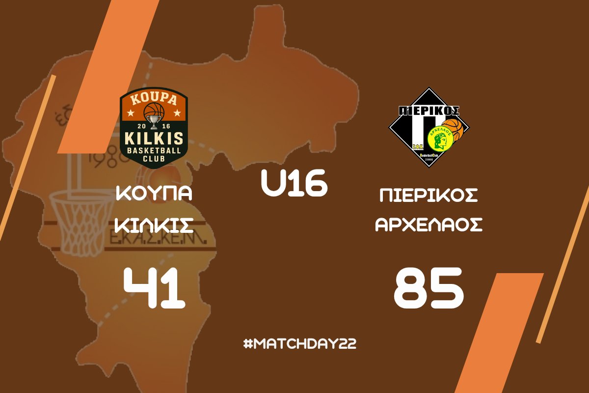 Ο Πιερικός Αρχέλαος επικράτησε με 41-85 της ΚουΠα Κιλκίς, στο Κλειστό Γυμναστήριο Κιλκίς, σε αγώνα για την 8η και τελευταία αγωνιστική του α’ ομίλου της β’ φάσης του πρωταθλήματος παίδων της ΕΚΑΣΚΕΜ.