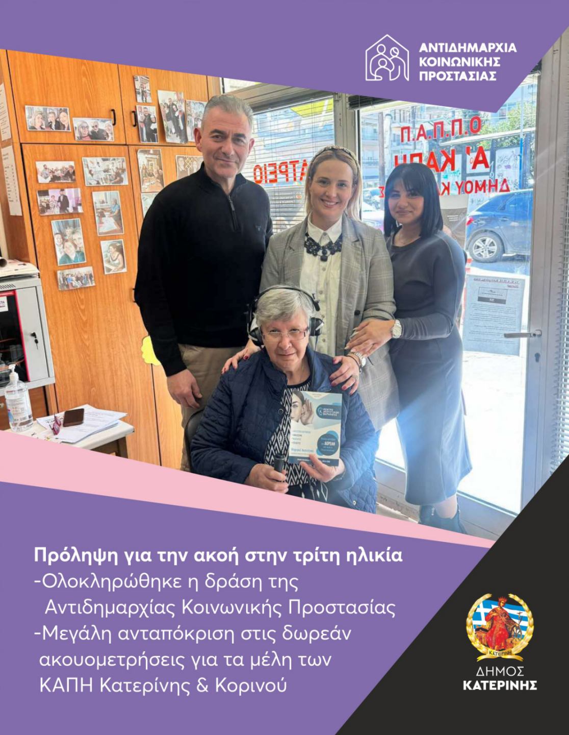 Με μεγάλη συμμετοχή των μελών ολοκληρώθηκε ο κύκλος των δωρεάν προληπτικών ελέγχων ακοής (ακουομετρήσεων) στα ΚΑΠΗ Κατερίνης και Κορινού. Η δράση υλοποιήθηκε από την Αντιδημαρχία Κοινωνικής Προστασίας, στο πλαίσιο του εορτασμού της Παγκόσμιας Ημέρας Ακοής (3 Μαρτίου), με στόχο την ευαισθητοποίηση και την προαγωγή της υγείας των ατόμων της τρίτης ηλικίας.