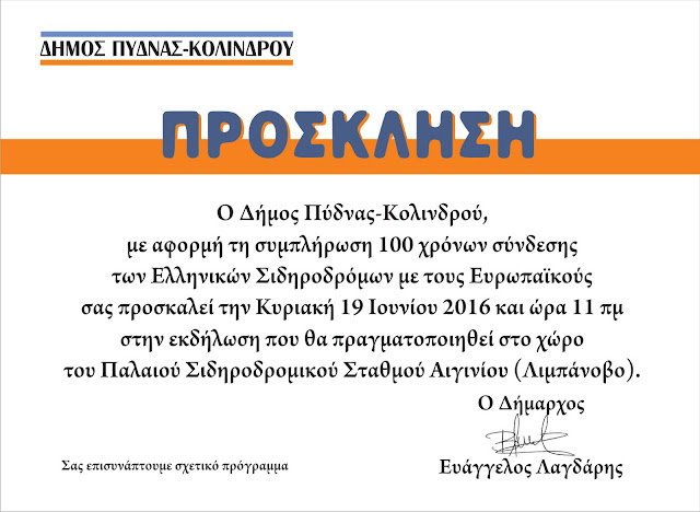 Με αφορμή τη συμπλήρωση 100 χρόνων σύνδεσης των Ελληνικών σιδηροδρόμων με τους Ευρωπαϊκούς, ο Δήμος Πύδνας Κολινδρού πραγματοποιεί επετειακή αναμνηστική εκδήλωση. την Κυριακή 19 Ιουνίου 2016 και ώρα 11 π.μ., στον χώρο του Παλαιού Σιδηροδρομικού Σταθμού Αιγινίου (ΛΙΜΠΑΝΟΒΟ).