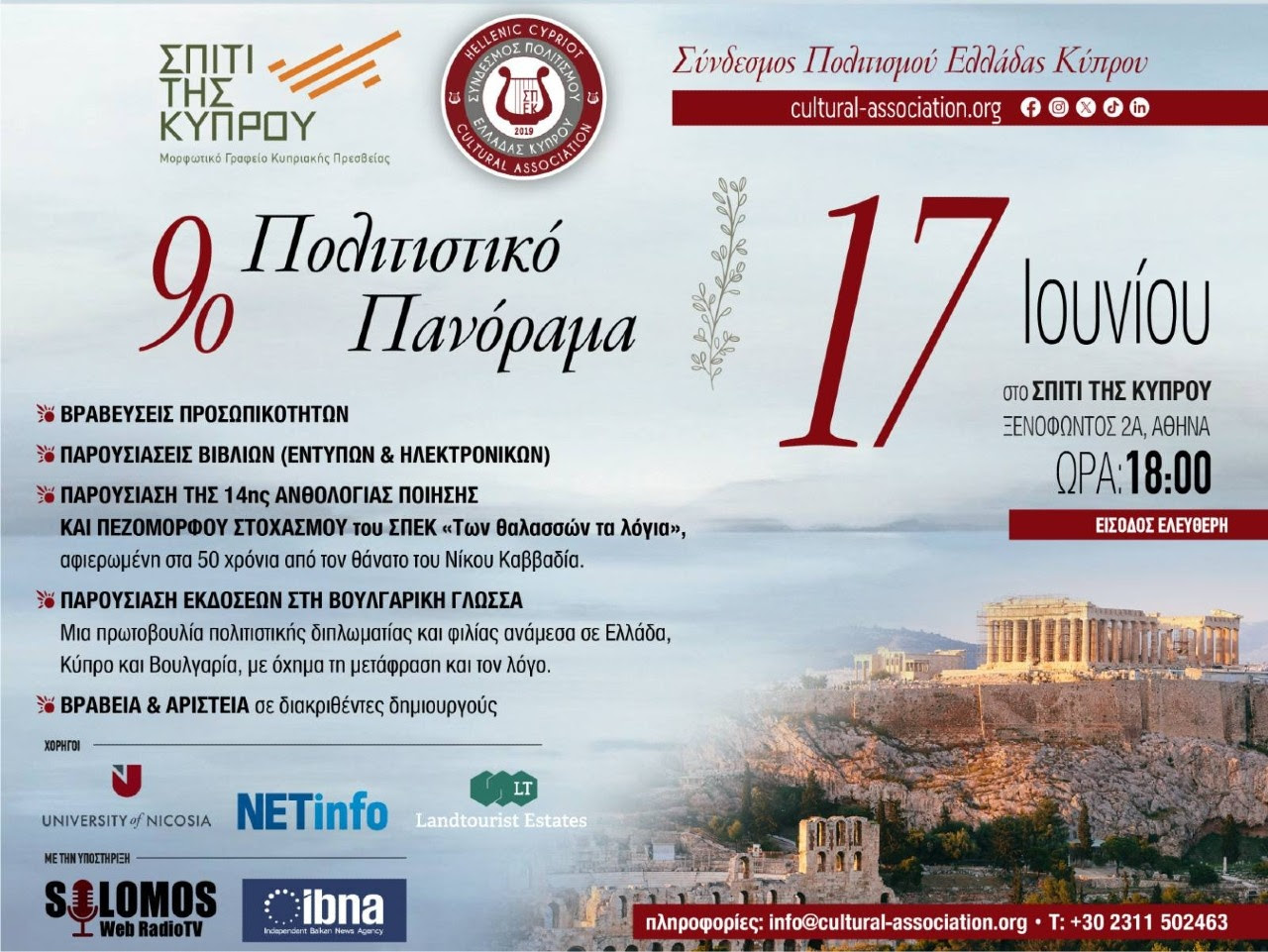 Ο Σύνδεσμος Πολιτισμού Ελλάδας Κύπρου (ΣΠΕΚ), στο πλαίσιο του ετήσιου θεσμού του, διοργανώνει το 9ο Πολιτιστικό Πανόραμα την Τρίτη 17 Ιουνίου 2025 στις 18:00, στο Σπίτι της Κύπρου, τον φιλόξενο χώρο της Πρεσβείας της Κυπριακής Δημοκρατίας στην Αθήνα. Μια κορυφαία πολιτιστική σύμπραξη που ενώνει δημιουργούς, στοχαστές και προσωπικότητες από Ελλάδα, Κύπρο, Απόδημο Ελληνισμό και φιλέλληνες του εξωτερικού.