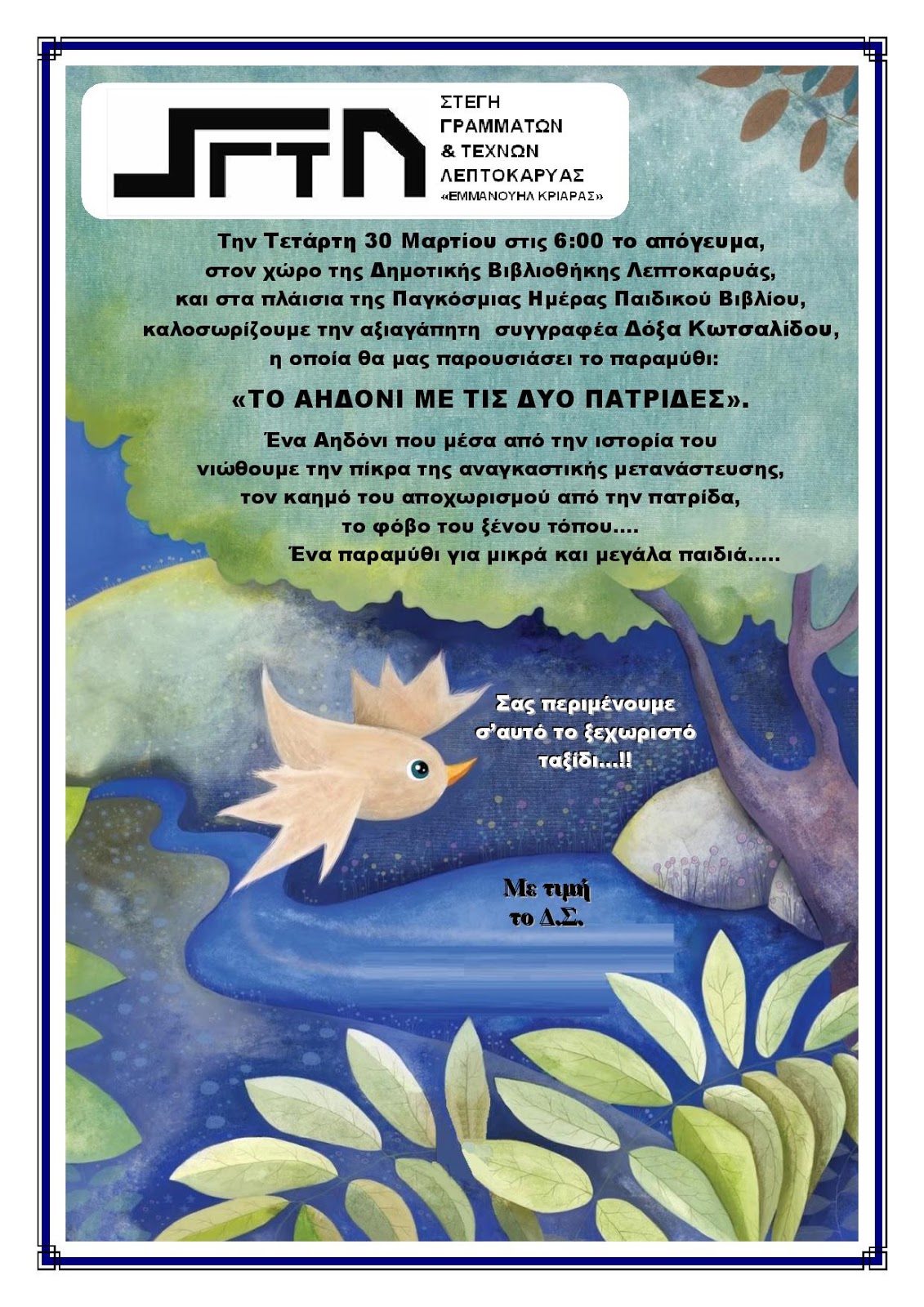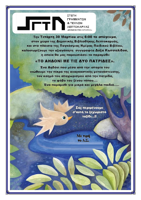 ΣΗΜΕΡΑ Η  ΒΙΒΛΙΟΠΑΡΟΥΣΙΑΣΗ ΑΠΟ ΤΗ ΣΤΕΓΗ ΓΡΑΜΜΑΤΩΝ ΚΑΙ ΤΕΧΝΩΝ ΛΕΠΤΟΚΑΡΥΑΣ “ΕΜΜΑΝΟΥΗΛ ΚΡΙΑΡΑΣ”