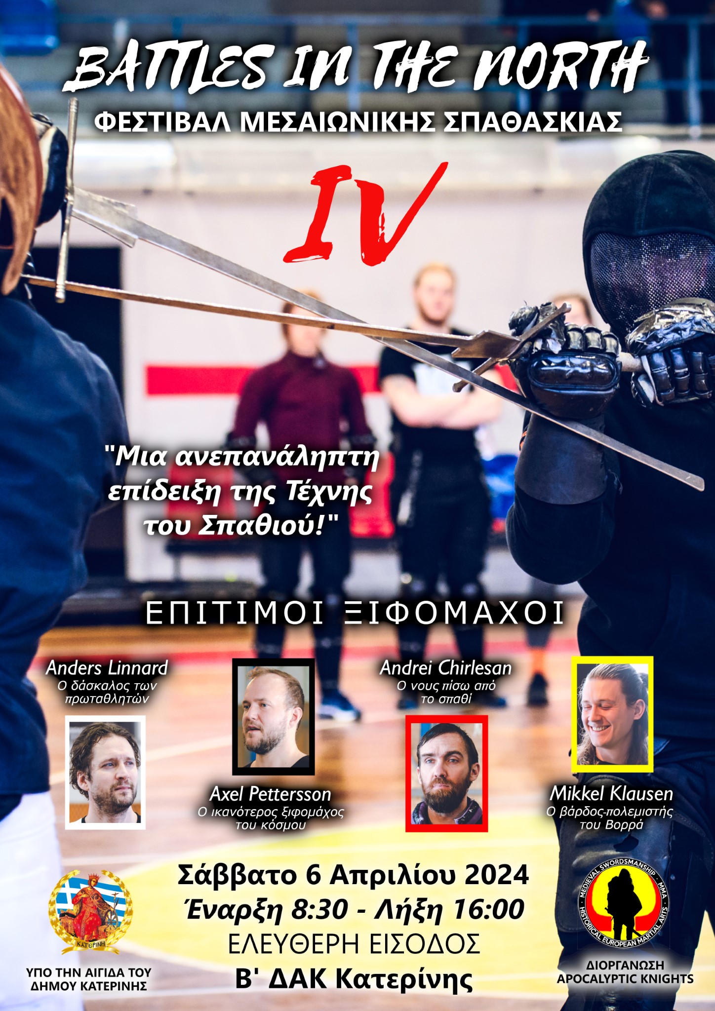 Η Κατερίνη φιλοξενεί το 4ο Διεθνές Φεστιβάλ Ιστορικής Σπαθασκίας το Σαββατοκύριακο 6-7 Απριλίου στο Β΄ΔΑΚ με τη συμμετοχή διακεκριμένων αθλητών από την Ελλάδα και την Ευρώπη.