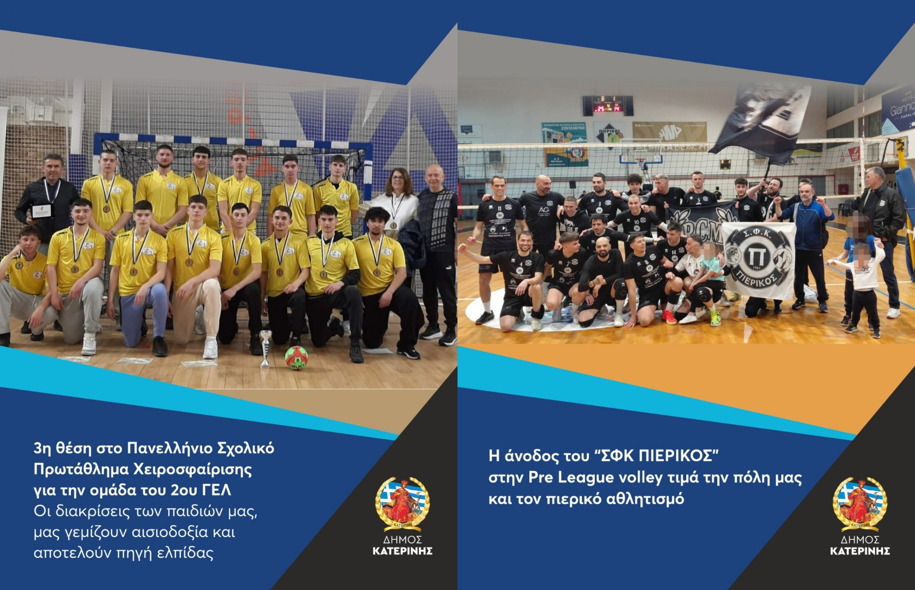 Συγχαρητήριο μήνυμα Δημάρχου Κατερίνης: 1. για τη διάκριση του 2ου ΓΕΛ στο Πανελλήνιο Σχολικό Πρωτάθλημα Χειροσφαίρισης 2.για την άνοδο της ομάδας volley του “ΣΦΚ ΠΙΕΡΙΚΟΣ” στην Pre League