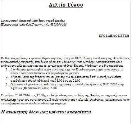 - Ο αγώνας κλιμακώνεται, καθολική συμμετοχή στο συλλαλητήριο στις 28/01/2016 στην Agrotica (Θεσσαλονίκη) στις 15.00