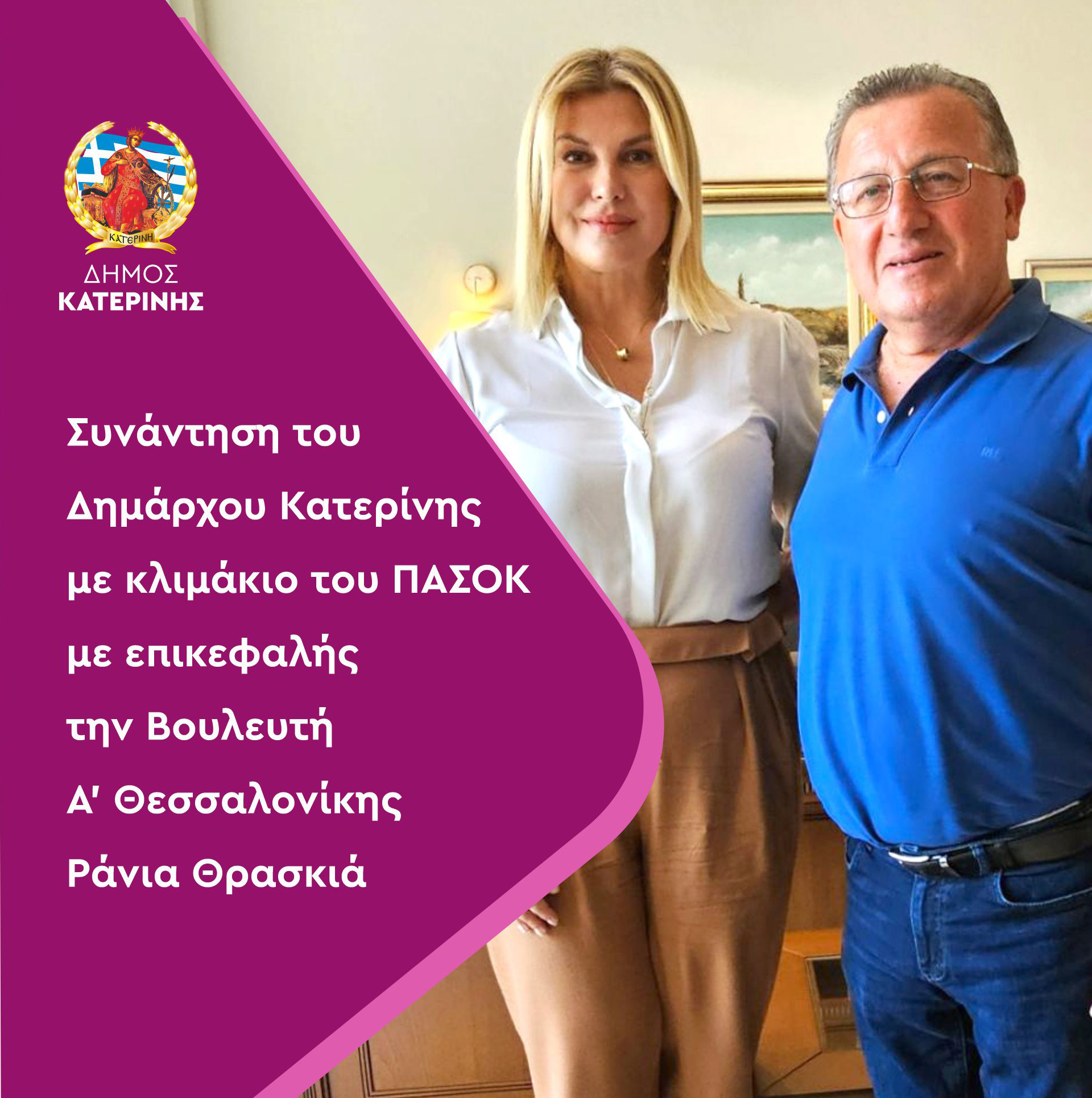 Κλιμάκιο του ΠΑΣΟΚ με επικεφαλής την Ράνια Θρασκιά, Βουλευτή Α’ Θεσσαλονίκης και με την συμμετοχή των:  Δημήτρη Σαρηγιάννη – Γραμματέα Τομέα Υποδομών & Διευθυντή του Γραφείου του προέδρου του ΠΑΣΟΚ στη Θεσσαλονίκη, Νίκο Ηλιού – Γραμματέα Τομέα Μεταφορών, Χρήστου Παπαστεργίου, Περιφερειακού Συμβούλου Κεντρικής Μακεδονίας (επικεφαλής της παράταξης «Πράξεις για τη Μακεδονία»), Τασούλας Γεωργιάδου – Συντονίστριας του Γραφείου του προέδρου του ΠΑΣΟΚ στη Θεσσαλονίκη, Ηλία Ίτσιου – μέλος της γραμματείας του τομέα συνοχής & οικογένειας, επισκέφτηκε σήμερα - στο πλαίσιο περιοδείας του στην Πιερία - τον Δήμαρχο Κατερίνης Ιωάννη Ντούμο. Το κλιμάκιο συνόδευαν ο Γραμματέας της Ν.Ε. Πιερίας του ΠΑΣΟΚ, Δημήτρης Λιόλιος, τα μέλη της κεντρικής επιτροπής του κόμματος: Μαρία Μίχου - πρώην βουλευτής, Κώστας Κιτιξής, o πρώην περιφερειακός σύμβουλος, Χρήστος Τζουβάρας, το μέλος της Ν.Ε. ΠΑΣΟΚ Πιερίας, Βασίλης Σιαμάτρας,