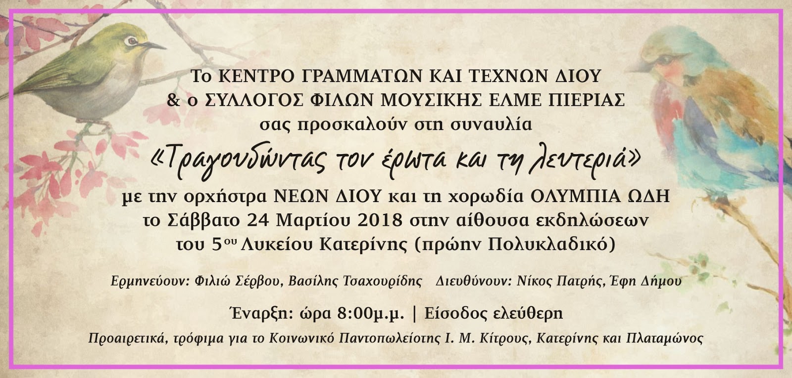 ΣΥΝΑΥΛΙΑ ΜΕ ΘΕΜΑ “ΤΡΑΓΟΥΔΩΝΤΑΣ ΤΟΝ ΕΡΩΤΑ ΚΑΙ ΤΗ ΛΕΥΤΕΡΙΑ”