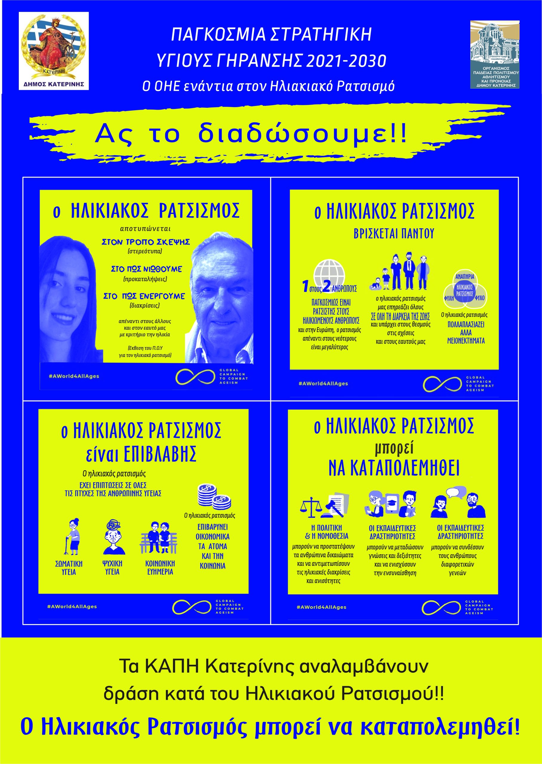 Τα ΚΑΠΗ Κατερίνης αποτίνουν φόρο Τιμής στην Παγκόσμια ημέρα ηλικιωμένων συμμετέχοντας με τις δράσεις τους και προωθώντας την καμπάνια που οργανώνουν τα κράτη μέλη του Παγκόσμιου Οργανισμού Υγείας και του ΟΗΕ για τον ηλικιακό ρατσισμό!