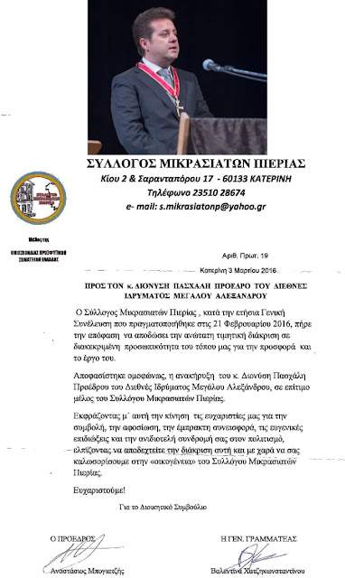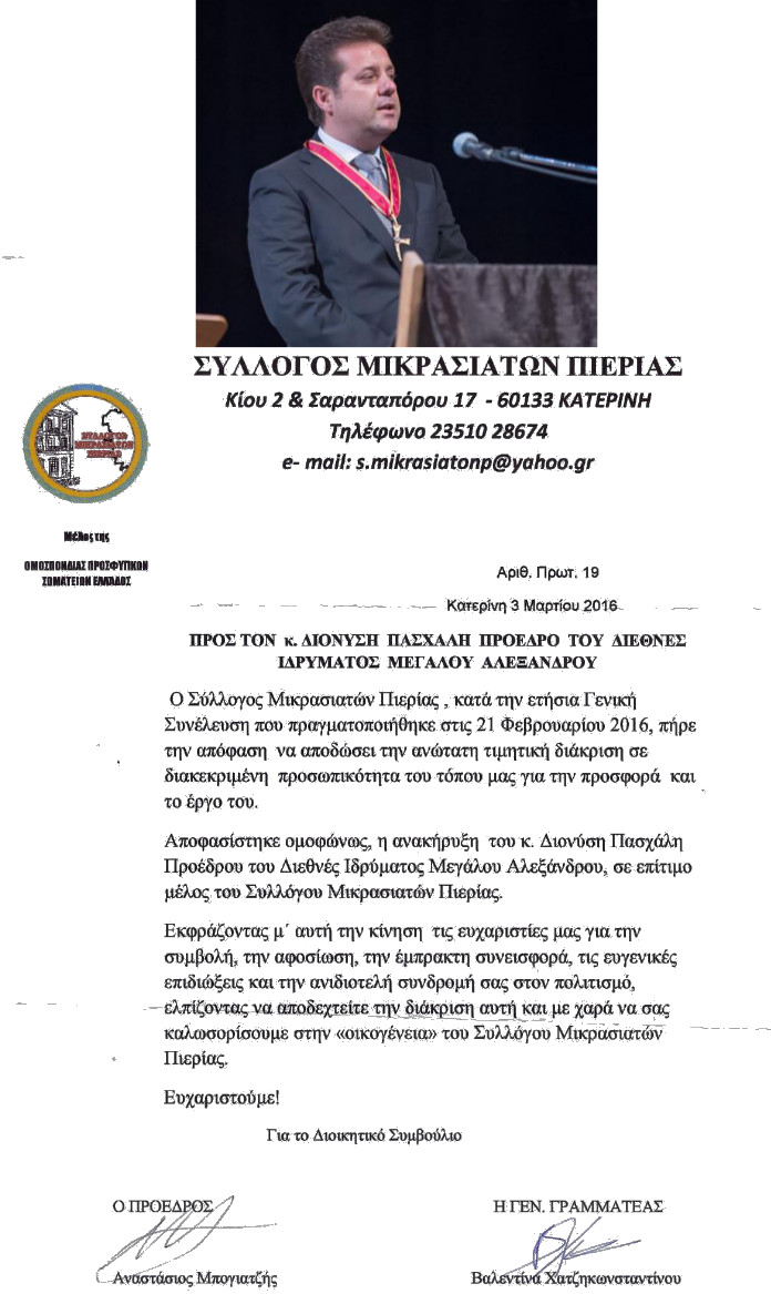ΤΗΝ ΑΝΩΤΑΤΗ ΤΙΜΗΤΙΚΗ ΔΙΑΚΡΙΣΗ ΟΠΩΣ ΟΡΙΖΕΤΑΙ ΣΤΟ ΚΑΤΑΣΤΑΤΙΚΟ ΤΟΥ ΑΠΕΔΩΣΕ ΟΜΟΦΩΝΑ Ο ΣΥΛΛΟΓΟΣ ΜΙΚΡΑΣΙΑΤΩΝ ΠΙΕΡΙΑΣ ΣΤΟΝ ΠΡΟΕΔΡΟ κ. ΔΙΟΝΥΣΗ ΠΑΣΧΑΛΗ