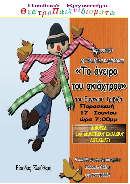 “ΤΟ ΟΝΕΙΡΟ ΤΟΥ ΣΚΙΑΧΤΡΟΥ” ΜΙΑ ΘΕΑΤΡΙΚΗ ΠΑΡΑΤΑΣΤΑΣΗ ΤΟΥ ΠΑΙΔΙΚΟΥ ΕΡΓΑΣΤΗΡΙΟΥ ΘΕΑΤΡΟΠΑΙΧΝΙΔΙΣΜΑΤΑ ΤΗΝ ΠΑΡΑΣΚΕΥΗ 17 ΙΟΥΝΙΟΥ ΣΤΗΝ ΑΙΘΟΥΣΑ ΤΟΥ 1ου ΔΗΜΟΤΙΚΟΥ ΣΧΟΛΕΙΟΥ ΛΙΤΟΧΩΡΟΥ.