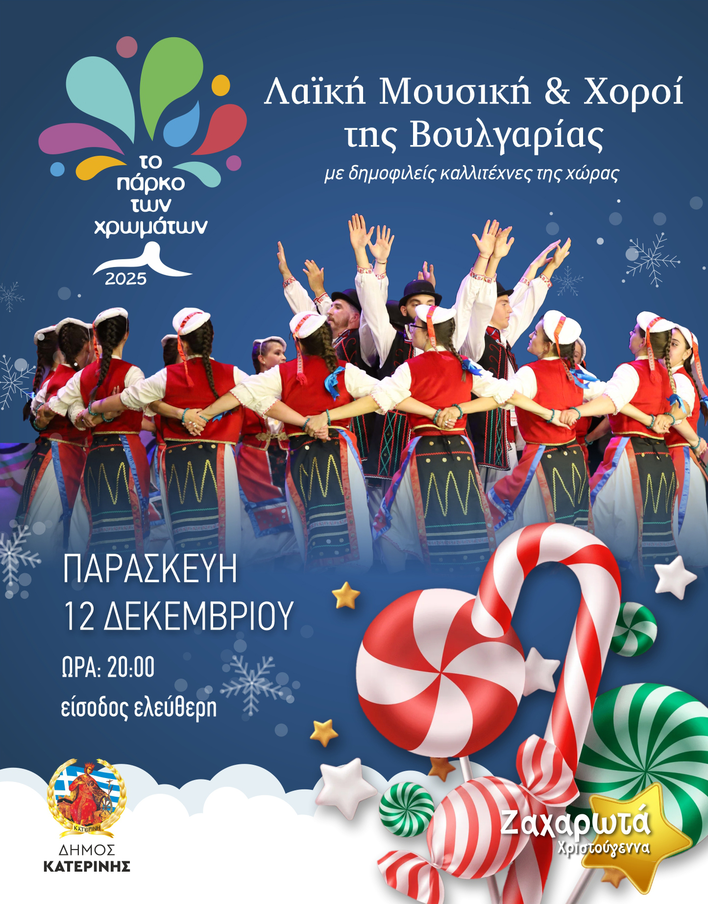 Τη δυνατότητα να απολαύσουν τραγούδια, χορούς & λαϊκά παραμύθια της Βουλγαρίας, θα έχουν οι επισκέπτες του Πάρκου των Χρωμάτων, αύριο Παρασκευή 12 Δεκεμβρίου & ώρα 20:00. Ένα πολιτιστικό πρόγραμμα, που υλοποιήθηκε με την οικονομική υποστήριξη της ΕΕ (Next Generation) και παρουσιάζει σε όλη την Ευρώπη, τις αξίες, την ομορφιά και την ποικιλομορφία της βουλγαρικής λαογραφίας.