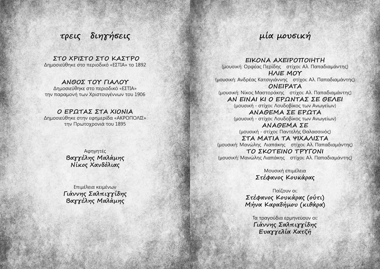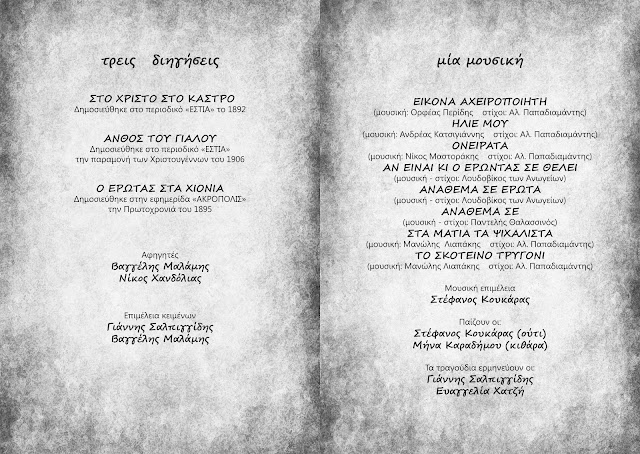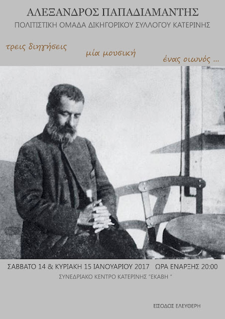 H Πολιτιστική Ομάδα του Δικηγορικού Συλλόγου Κατερίνης παρουσιάζει σε μια παράσταση λόγου, θεάτρου και μουσικής τρία Χριστουγεννιάτικα διηγήματα του Αλέξανδρου Παπαδιαμάντη. "Στο Χριστό στο Κάστρο", "Ανθος του Γιαλού", "Ο Ερωτας στα Χιόνια". Οι παραστάσεις θα δοθούν στην αίθουσα του 1ου ορόφου του Συνεδριακού Κέντρου του Δήμου Κατερίνης (ΕΚΑΒΗ) το Σάββατο 14 και την Κυριακή 15 Ιανουαρίου 2017 και ώρα 20:00.