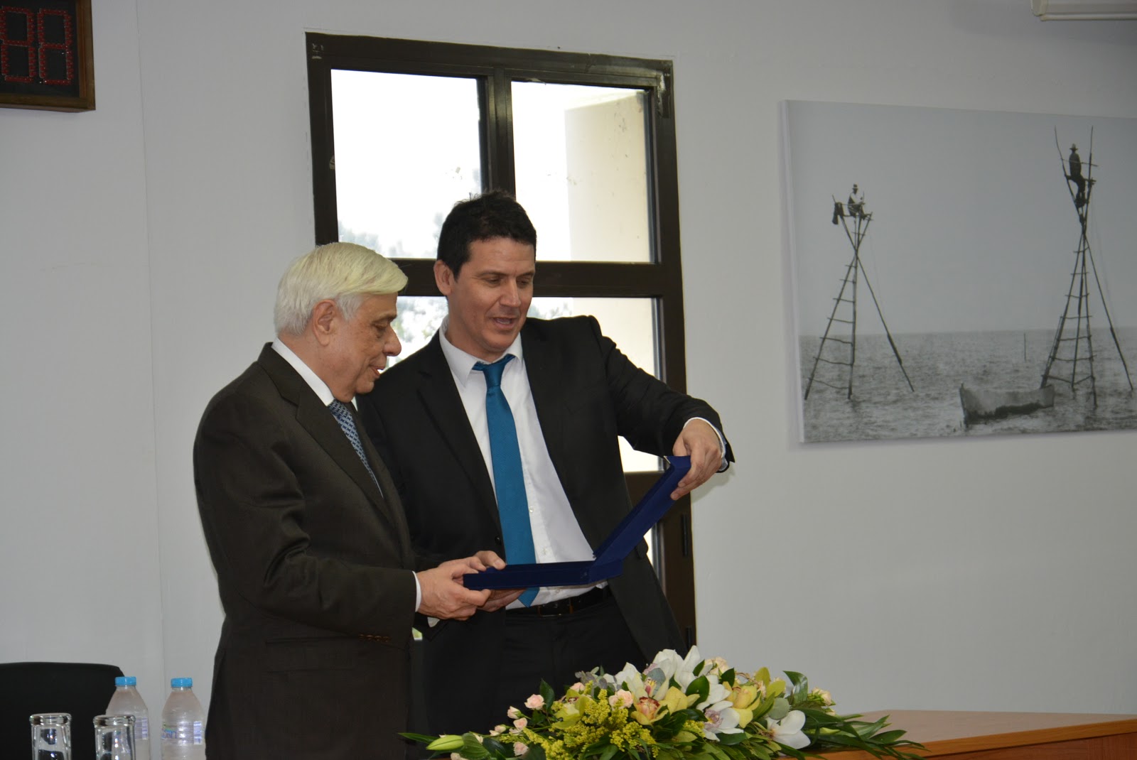 Με συγκίνηση ο Πρώτος Πολίτης της Χώρας, παρέλαβε την αναμνηστική πλακέτα και αποδέχθηκε την τιμή αυτή. Λαμβάνοντας το λόγο ευχαρίστησε τα μέλη του Δημοτικού Συμβουλίου και τόνισε τη σημειολογία της Επανάστασης του Ολύμπου στις μετέπειτα εξελίξεις που οδήγησαν στον Μακεδονικό Αγώνα και την απελευθέρωση της Μακεδονίας, αναφερόμενος με λεπτομέρεια στα γεγονότα της εποχής. Επίσης, αναφέρθηκε στο αδιαμφισβήτητο κύρος της Συνθήκης της Λοζάνης με την οποία καθορίζονται τα ανατολικά σύνορα της Ελλάδος και, επομένως, της Ευρωπαϊκής Ένωσης. Περαιτέρω, επεσήμανε ότι οι όποιες διαπραγματεύσεις του Πρωθυπουργού της πΓΔΜ στερούνται της σχετικής εξουσιοδότησης από τη βουλή των Σκοπίων, διότι το Σύνταγμα της γείτονος αναφέρει ρητά το όνομα της χώρας αυτής. Επομένως, όπως ανέφερε, η συνταγματική αναθεώρηση πρέπει να προηγηθεί των διαπραγματεύσεων προκειμένου από πλευράς Σκοπίων, να έχουν ισχύ στην έννομη τάξη.