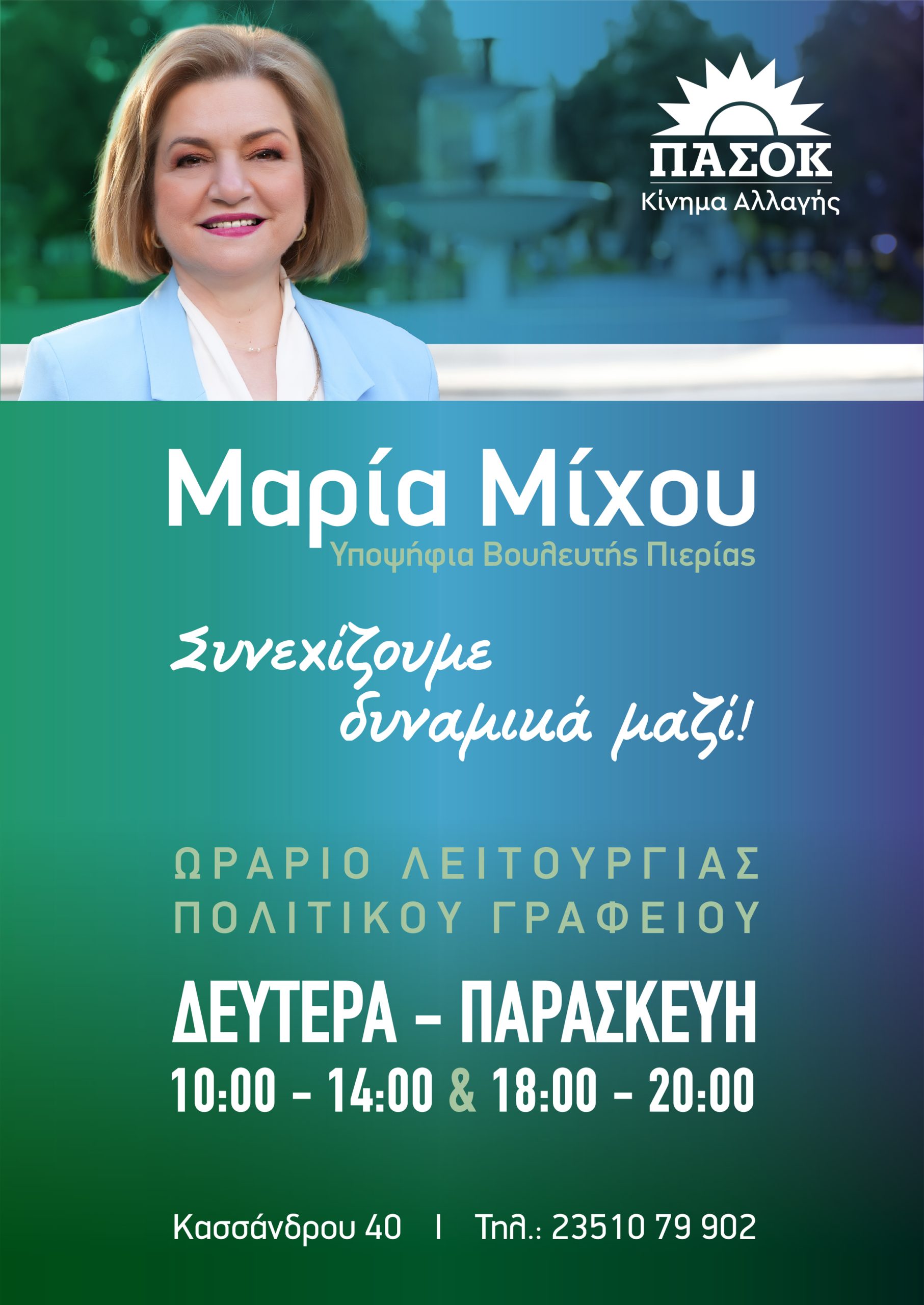 ΩΡΑΡΙΟ ΛΕΙΤΟΥΡΓΙΑΣ ΠΟΛΙΤΙΚΟΥ ΓΡΑΦΕΙΟΥ ΜΙΧΟΥ ΜΑΡΙΑ