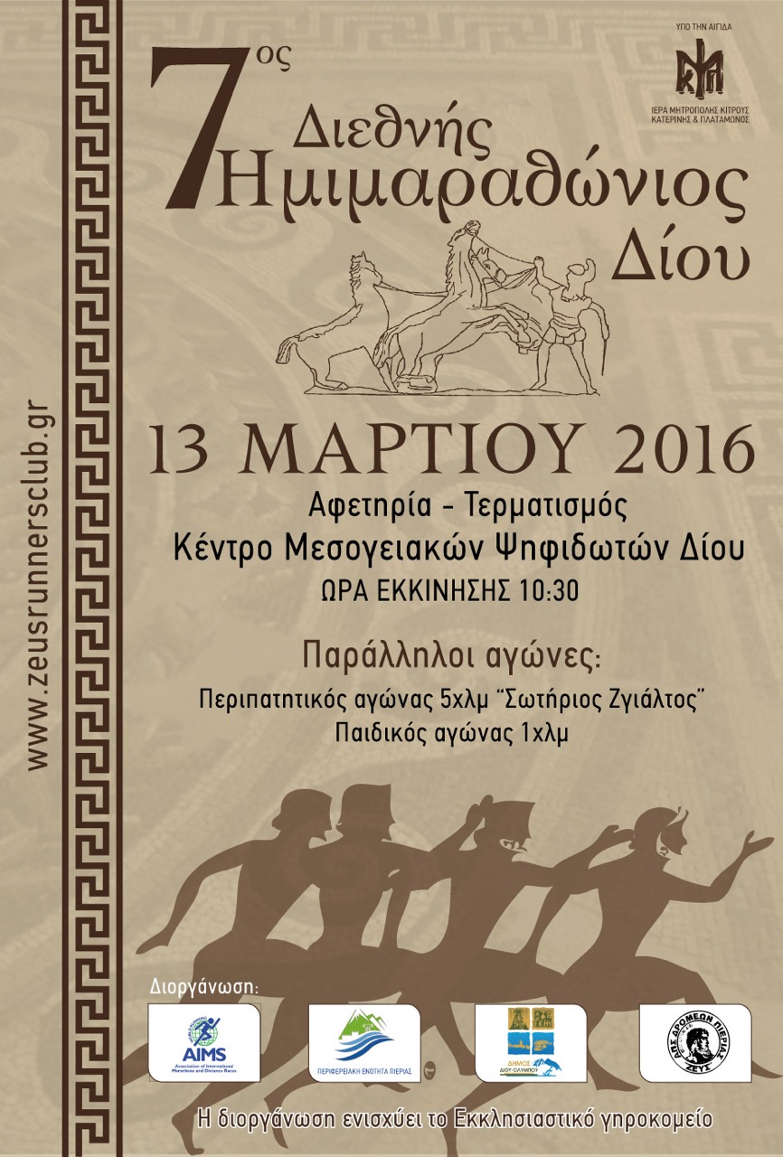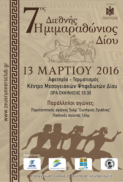 Ο 7ος Διεθνής Ημιμαραθώνιος ΔΙΟΝ θα διεξαχθεί την Κυριακή 13 Μαρτίου 2016 με αφετηρία το Κέντρο Μεσογειακών Ψηφιδωτών Δίου, ενώ παράλληλα διεξάγεται ο Περιπατητικός αγώνας 5 χλμ «Σωτήριος Ζγιάλτος» και ο αγώνας δρόμου 1 χλμ για παιδιά δημοτικών και γυμνασίων.