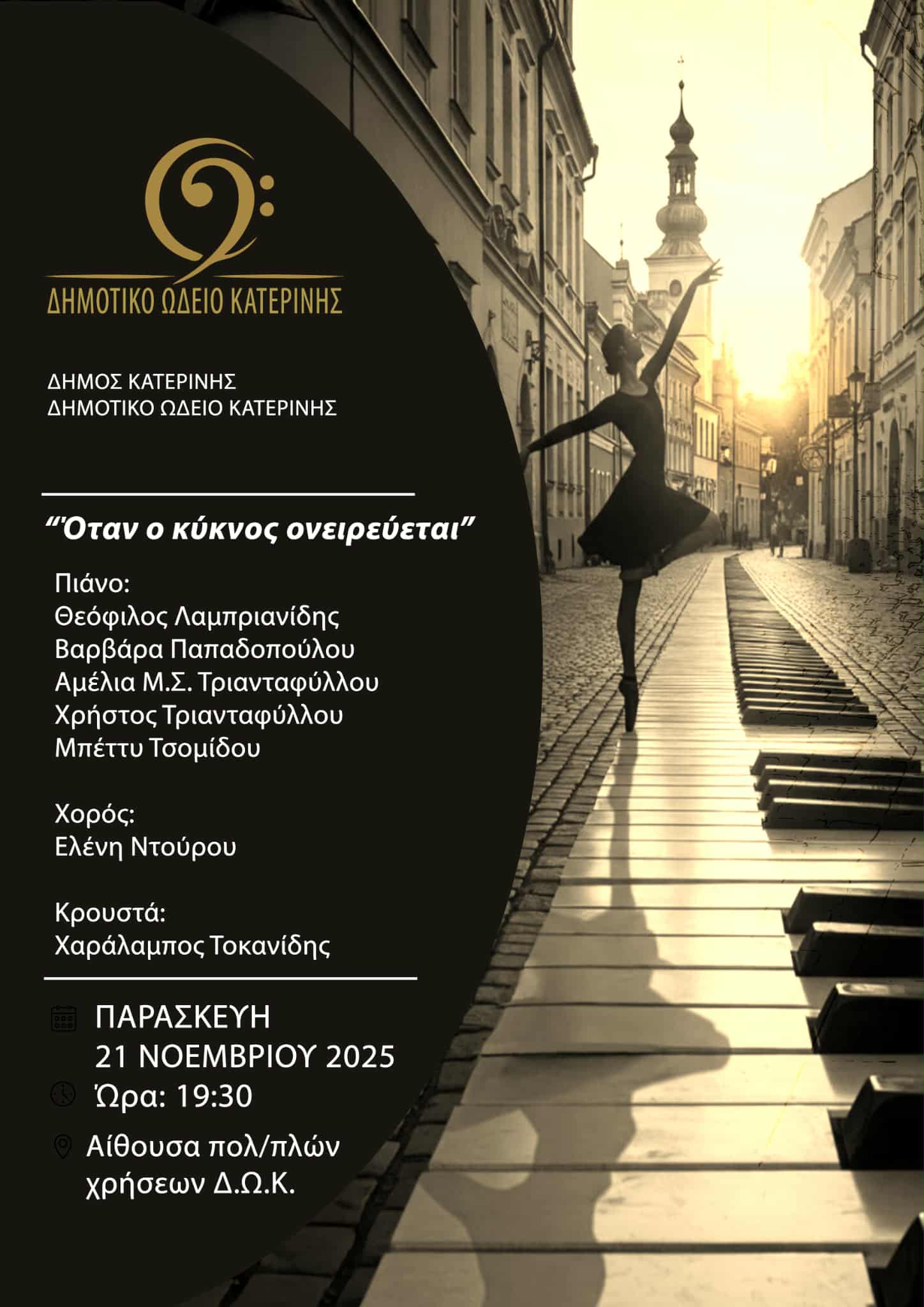 Tη μουσικοχορευτική βραδιά «Όταν ο κύκνος ονειρεύεται», παρουσιάζει το Δημοτικό Ωδείο Κατερίνης, μια συνάντηση ήχων και κινήσεων, όπου το πιάνο, ο χορός και τα κρουστά συνυπάρχουν σε κοινό σκηνικό χώρο για να αφηγηθούν, μέσα από τη γλώσσα της τέχνης. την ονειρική μεταμόρφωση του ήχου σε εικόνα και ρυθμό.