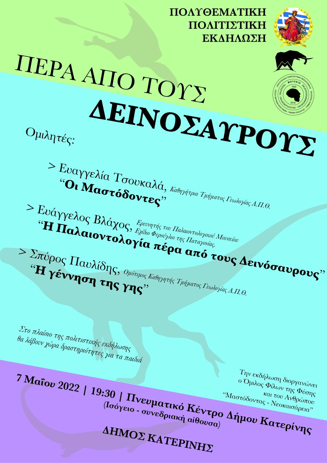 «ΠΕΡΑ ΑΠΟ ΤΟΥΣ ΔΕΙΝΟΣΑΥΡΟΥΣ» τιτλοφορείται η Πολυθεματική Πολιτιστική Εκδήλωση. που διοργανώνει ο Όμιλος Φίλων της Φύσης και του Ανθρώπου “Μαστόδοντας – Νεοκαισάρεια”, το Σάββατο 07 Μαΐου & ώρα 19:30, στο Πνευματικό Κέντρο του Δήμου Κατερίνης (Ισόγειο – συνεδριακή αίθουσα).