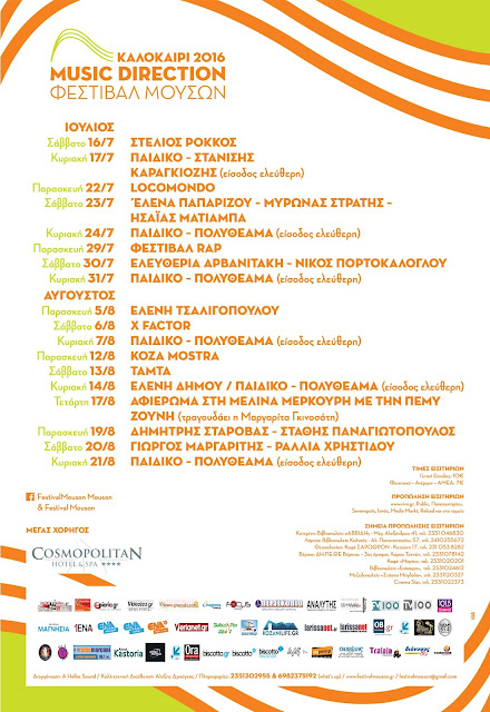 Το MusicDirection– 4οΦεστιβάλ Μουσών επανέρχεται δριμύτερο και ανανεωμένο, φιλοδοξώντας να προσφέρει δύο μήνες (Ιούλιο και Αύγουστο 2016) γεμάτους ψυχαγωγία και διασκέδαση με πολλή μουσική στους κατοίκους και τους επισκέπτες της Πιερίας, αλλά και των γύρω περιοχών.
