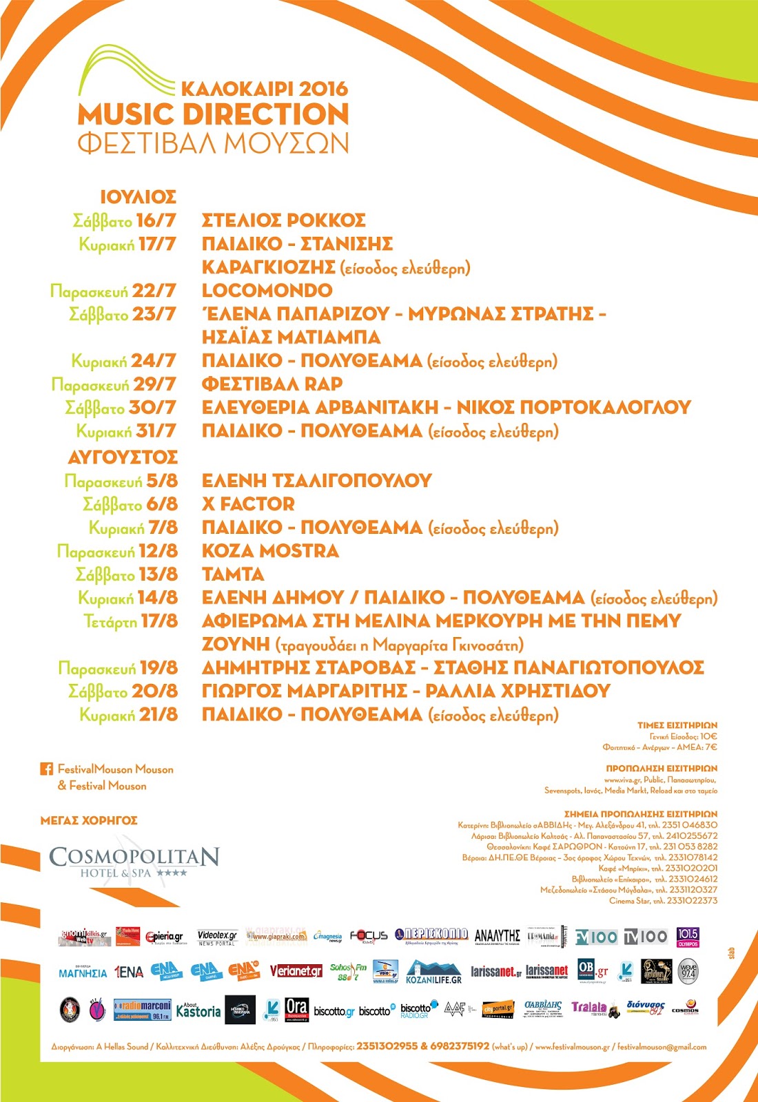 Το MusicDirection– 4οΦεστιβάλ Μουσών επανέρχεται δριμύτερο και ανανεωμένο, φιλοδοξώντας να προσφέρει δύο μήνες (Ιούλιο και Αύγουστο 2016) γεμάτους ψυχαγωγία και διασκέδαση με πολλή μουσική στους κατοίκους και τους επισκέπτες της Πιερίας, αλλά και των γύρω περιοχών.