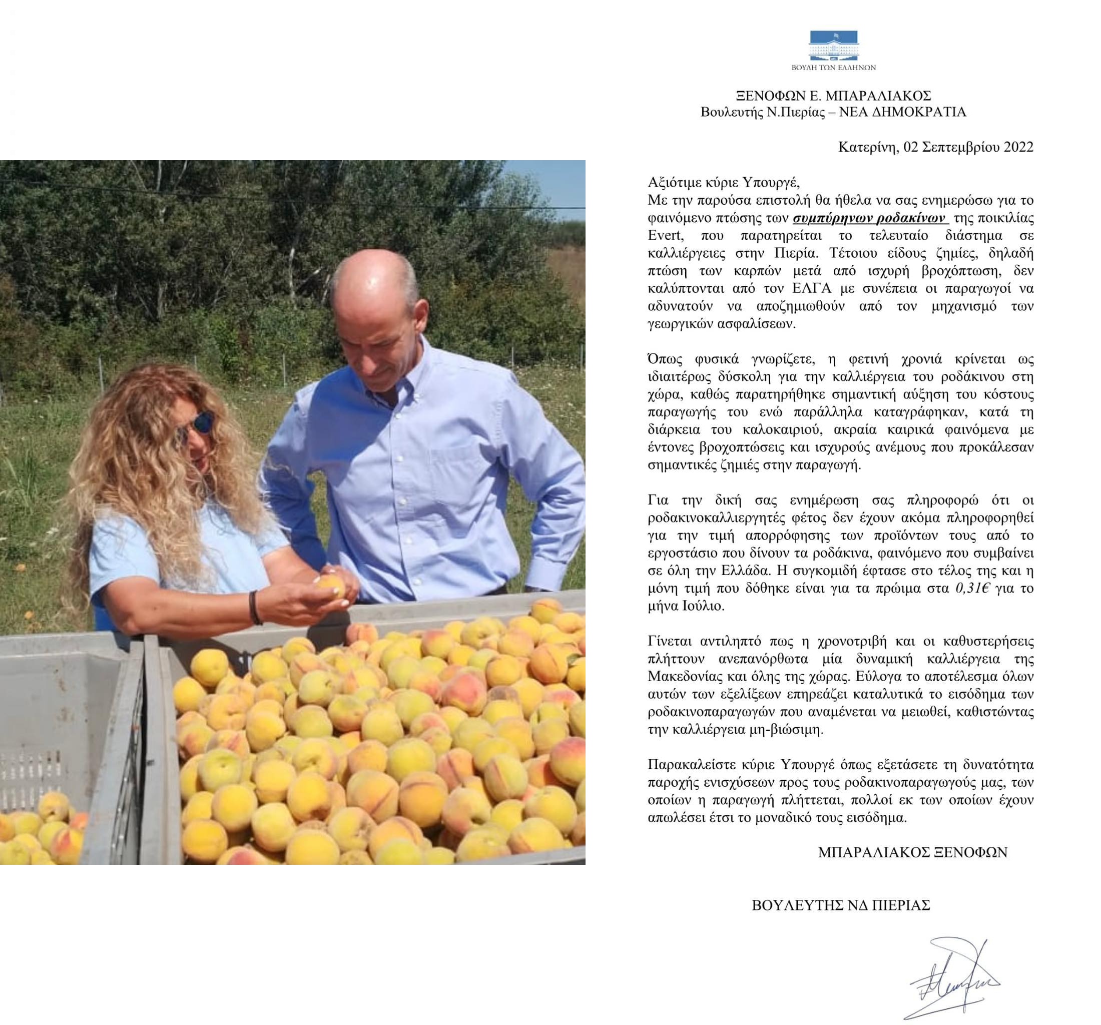 Για την ζημία που προκλήθηκε στις συγκεκριμένες παραγωγές από την βροχόπτωση του Αυγούστου, ο κ. Μπαραλιάκος είχε ενημερωθεί άμεσα από την Πρόεδρο του Αγροτικού Συνεταιρισμού Κάτω Αγιάννη κα. Βούλα Γελαστοπούλου, την οποία και ευχαρίστησε θερμά . Με επιστολή του προς τον Υπουργό Αγροτικής Ανάπτυξης στις 2 Σεπτεμβρίου 2022, ο Βουλευτής Πιερίας ζήτησε την ενίσχυση των καλλιεργητών που επλήγη η παραγωγή τους επιφέροντας σημαντική απώλεια στο εισόδημά τους.