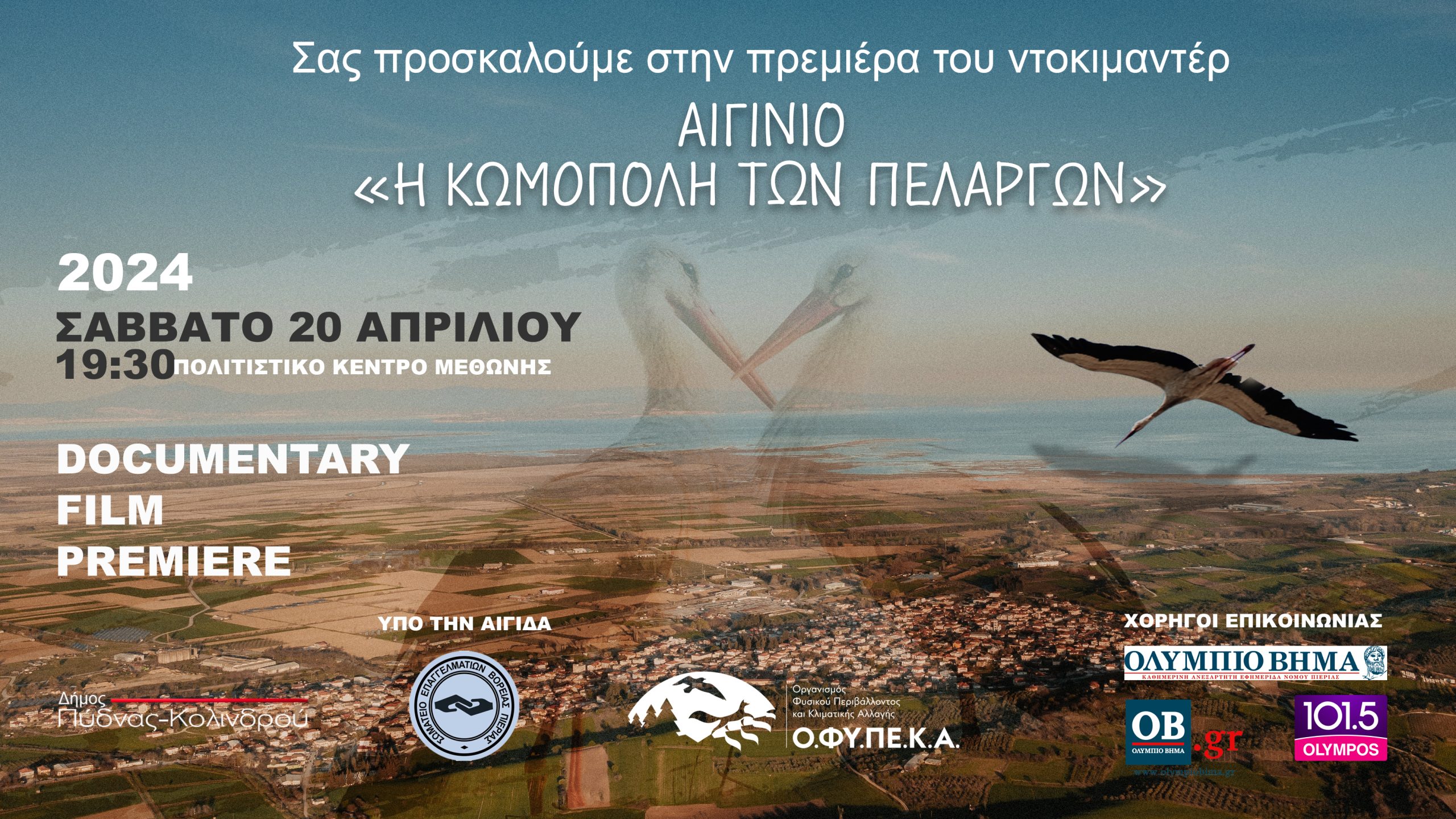 Σας προσκαλούμε στη πρεμιέρα του Ντοκιμαντέρ ΑΙΓΙΝΙΟ "Η ΚΩΜΟΠΟΛΗ ΤΩΝ ΠΕΛΑΡΓΩΝ" Σάββατο 20 Απριλίου 2024 & ώρα 19:30 στο Πολιτιστικό Κέντρο Μεθώνης, υπο την αιγίδα του Δήμου Πύδνας-Κολινδρού, του Σωματείου Επαγγελματιών Β. Πιερίας και του Οργανισμού Φυσικού Περιβάλλοντος και κλιματικής Αλλαγής.
