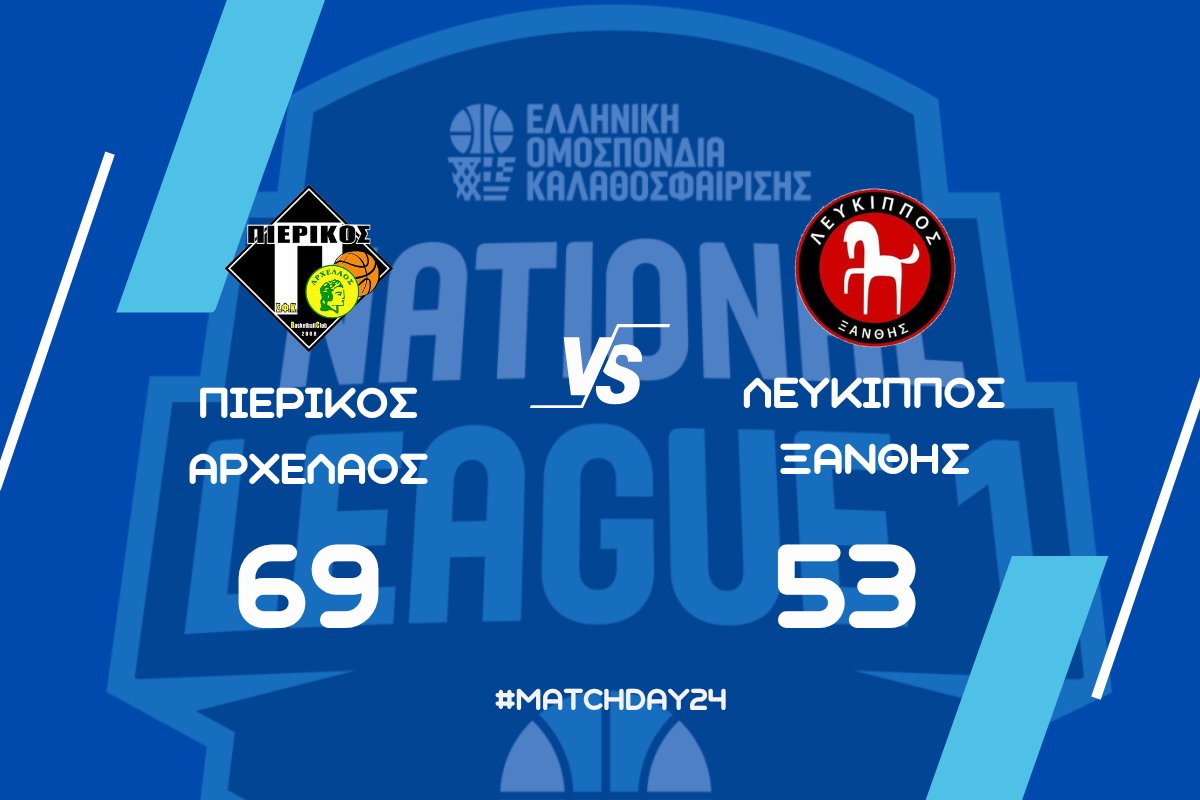 Ο Πιερικός Αρχέλαος επικράτησε με 69-53 του Λεύκιππου Ξάνθης, στο Κλειστό Γυμναστήριο Σιδηροδρομικού Σταθμού Κατερίνης, σε αγώνα για την 24η αγωνιστική του 3ου ομίλου της National League 1.