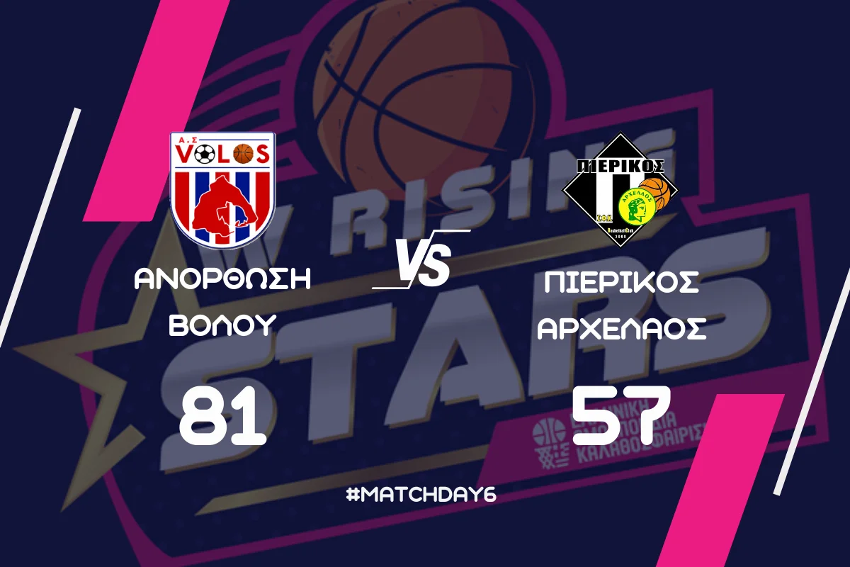 Ο Πιερικός Αρχέλαος ηττήθηκε με 81-57 από την Ανόρθωση Βόλου, στο Κλειστό Γυμναστήριο Επταπυργίου, σε αγώνα για την 6η αγωνιστική του W Rising Stars.